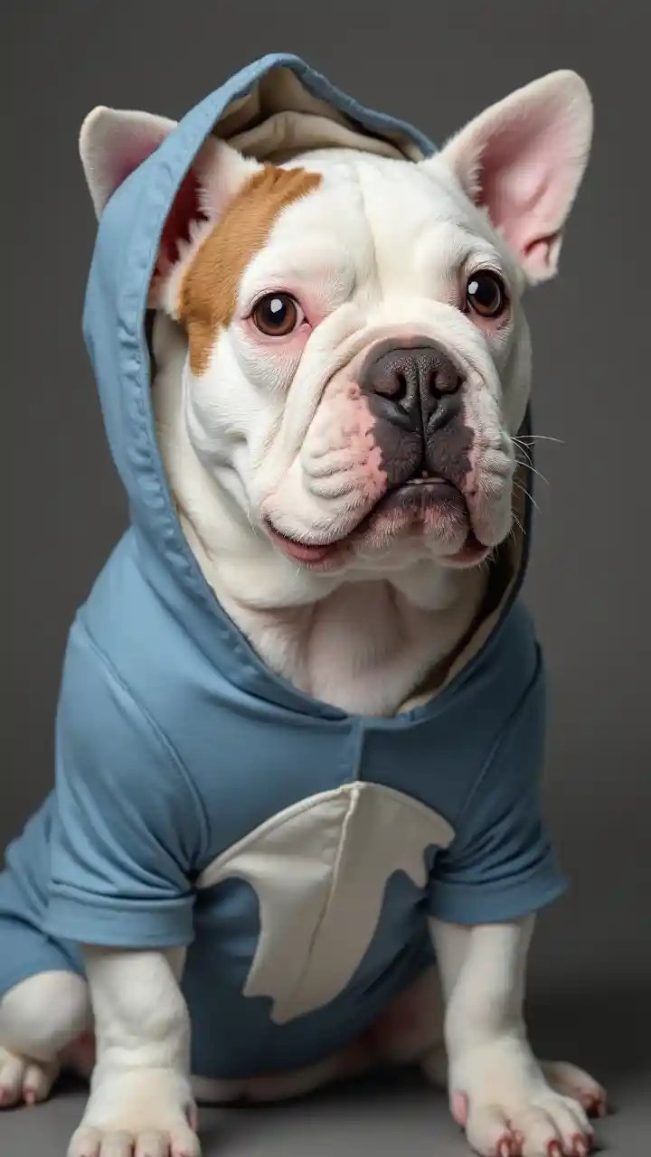 Ethanਇੱਕ ਸ਼ਾਰਕ ਵਨਸਾਈ ਵਿੱਚ ਇੱਕ ਅੱਖ ਤੇ ਇੱਕ ਭੂਰੇ ਬਿੰਦੀ ਵਾਲਾ ਇੱਕ ਚਿੱਟਾ ਬੁਲਡੌਗ