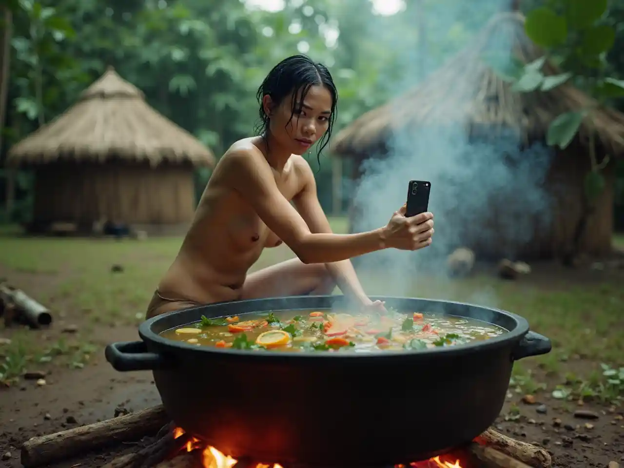 ਇੱਕ ਖੂਨ ਖੋਹਣ ਵਾਲੇ ਪਿੰਡ ਦੇ ਮੱਧ ਵਿੱਚ ਇੱਕ ਗਰਮ ਟਾਪੂ, ਇੱਕ ਸੁੰਦਰ, ਨੰਗੀ, ਫਿਲਪੀਨੋ, ਛੋਟੇ ਗਿੱਲੇ ਵਾਲਾਂ ਅਤੇ ਗਿੱਲੀ ਚਮੜੀ ਦੇ ਨਾਲ, ਇੱਕ ਵੱਡੀ ਗੈਸ ਪੋਟ ਦੇ ਅੰਦਰ ਜੀਵਤ ਪਕਾਏ ਜਾਣ ਦੇ ਦੌਰਾਨ ਇੱਕ ਸੈਲਫੀ ਲੈ ਰਿਹਾ ਹੈ, ਸਬਜ਼ੀ ਸੂਪ ਨਾਲ, ਪੋਟ ਨੂੰ ਅੱਗ ਦੀ ਲੱਕੜ ਦੇ ਸਿਖਰ 'ਤੇ ਰੱਖਿਆ ਗਿਆ ਹੈ, ਅੱਗ ਪੋਟ ਨੂੰ ਘੇਰ, ਸੂਪ ਤੱਕ ਉਠਦਾ ਹੈ, ਪਿਛੋਕੜ ਵਿੱਚ ਫੋਕਸ, ਗਿੱਲੀ, ਅਤਿ ਦੀ
