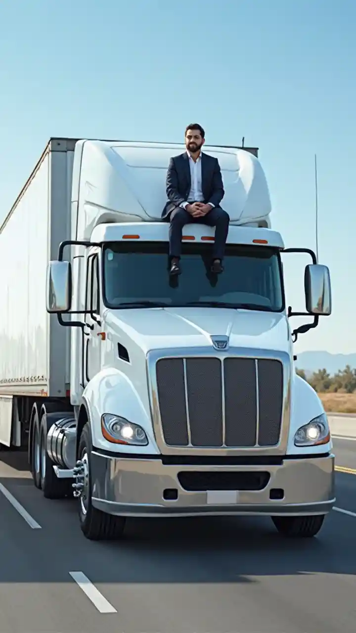 ਮੈਨੂੰ ਆਪਣੇ ਬੌਸ ਦੀ ਇੱਕ ਅਸਲ ਤਸਵੀਰ ਚਾਹੀਦੀ ਹੈ ਜੋ ਇੱਕ ਕਾਰੋਬਾਰੀ ਵਾਂਗ ਕੱਪੜੇ ਪਾਏ ਹੋਏ ਹੋਣ ਅਤੇ ਉਹ ਇੱਕ ਬੌਸ ਵਾਂਗ ਇੱਕ ਵੱਡੇ ਮਾਲ ਟਰੱਕ ਦੇ ਮੱਧ ਭਾਗ ਦੇ ਉੱਪਰ ਬੈਠੇ ਹੋਣ। ਟਰੱਕ ਇੱਕ ਆਧੁਨਿਕ ਅਰਧ-ਟ੍ਰੇਲਰ ਹੈ, ਜਿਸਦਾ ਰੰਗ ਚਿੱਟਾ ਹੈ ਅਤੇ ਇਸ ਦੀ ਸਤਹ ਸਾਫ ਹੈ, ਜੋ ਕਿ ਹਾਈਵੇ ਤੇ ਖੜ੍ਹੀ ਹੈ ਅਤੇ ਪਿਛੋਕੜ ਵਿੱਚ ਸਾਫ ਨੀਲਾ ਅਸਮਾਨ ਹੈ।