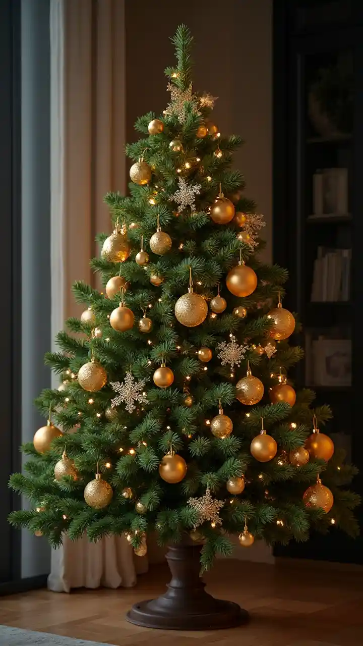 ਸੋਨੇ ਦੀਆਂ ਗੋਲੀਆਂ ਅਤੇ ਲਾਈਟਾਂ ਵਾਲਾ ਪ੍ਰੀਮੀਅਮ ਕ੍ਰਿਸਮਸ ਪਾਈਨ ਟ੍ਰੀ ਵਰਾਇਲ