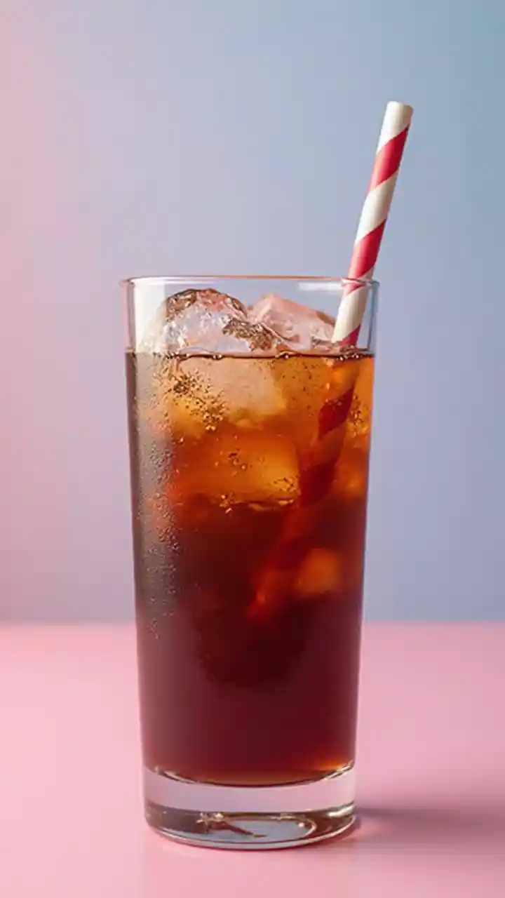 YamyGlass with cold brew coffee and ice and a straw, pink-blue background, sharp on details