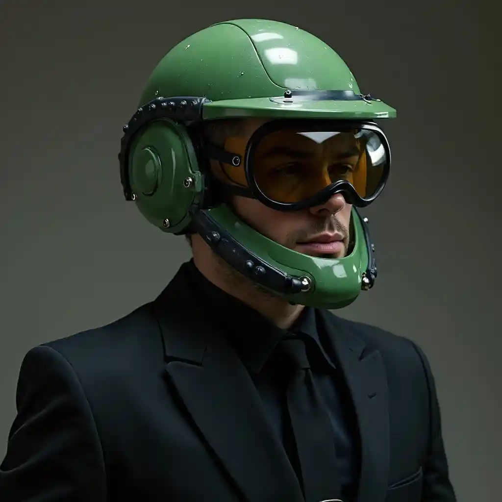 Rileyਕਾਲੇ ਸੂਟ ਵਿੱਚ ਇੱਕ ਆਦਮੀ, ਇੱਕ ਹਰੇ, ਆਧੁਨਿਕ ਲੜਾਈ ਟੋਪ ਪਹਿਨਦਾ ਹੈ, NVG ਗੋਲਸ ਨਾਲ, ਟੋਈ ਸਟੋਰੀ ਦੇ ਇੱਕ ਵੁਡੀ ਦੀ ਸ਼ੈਲੀ ਵਿੱਚ