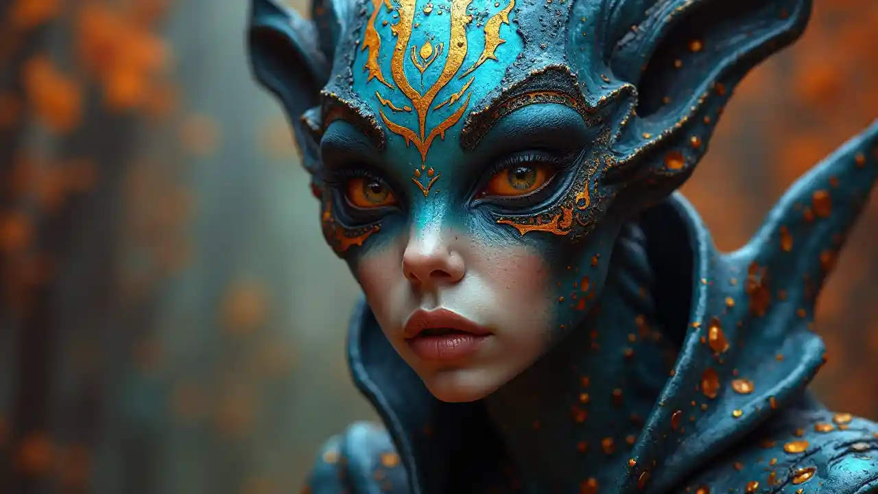 ਇੱਕ ਪਰਦੇਸੀ ਦਾ ਪੋਰਟਰੇਟ, ਬੈਟਿਕ, ਗੁੰਝਲਦਾਰ ਵੇਰਵੇ, ਸੁਪਰਰੀਅਲ, ਪਰਦੇਸੀ, ਸਾਈਬਰਪੰਕ ਟ੍ਰੈਸ਼ਕੋਰ ਸਟਾਈਲ, s 1000, ਚਮਕਦਾਰ, ਸੰਤ੍ਰਿਪਤ ਰੰਗ, ਸ਼ਾਨਦਾਰ, ਬਹੁਤ ਵਿਸਥਾਰ, ਫੈਸ਼ਨ, ਫੈਸ਼ਨ ਮੈਗਜ਼ੀਨ, ਤਿੱਖੀ ਫੋਕਸ, ਚਮਕਦਾਰ ਪ੍ਰਗਟ ਕਰਨ ਵਾਲਾ ਮੇਕਅਪ, ਨਾਟਕੀ ਰੋਸ਼ਨੀ, ਖੇਤਰ ਦੀ ਡੂੰਘਾਈ, ਬਹੁਤ ਵਿਸਥਾਰ ਨਾਲ ਧੁੰਦਲੀ ਪਿਛੋਕੜ, ਪੇਸ਼ੇਵਰ ਡਿਜੀਟਲ ਪੇਂਟਿੰਗ, ਸੰ