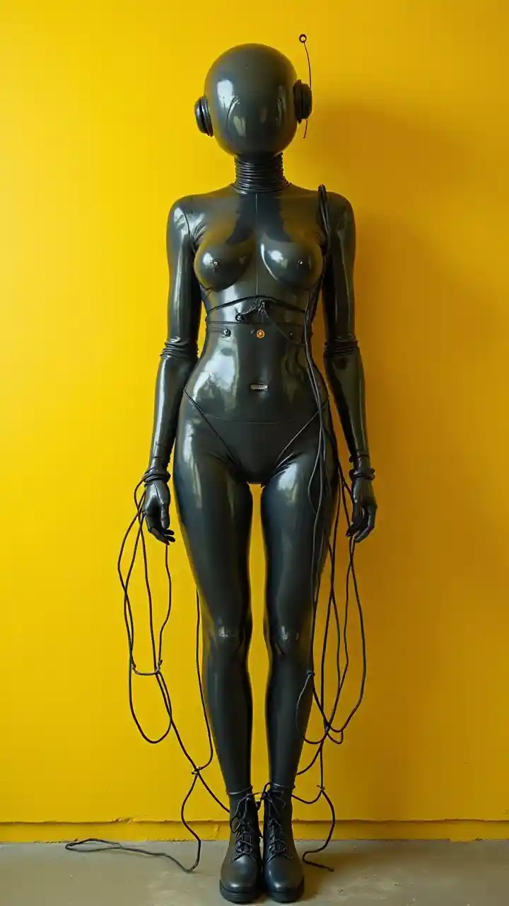 ਅੱਧਾ ਸਰੀਰ ਫੋਟੋਗ੍ਰਾਫੀ, ਇੱਕ ਪੀਲੀ ਕੰਧ ਦੇ ਸਾਹਮਣੇ, ਇੱਕ ਭਵਿੱਖਮੁਖੀ ਸਾਈਬਰਗ ਔਰਤ, ਕੇਬਲ ਅਤੇ ਤਾਰਾਂ ਨਾਲ ਅਤੇ LED, ਇੱਕ ਚੰਗੀ ਸ਼ਕਲ ਪਾਰਦਰਸ਼ੀ ਹਨੇਰੇ plexiglass ਲੈਟੇਕਸ ਸਰੀਰ ਪੀ ਸੀ ਰੋਬੋਟ ਸਿਲਵਰ ਮੋਟਰ ਸਿਰ, 80 ਡਿਗਰੀ ਦ੍ਰਿਸ਼, ਸਰਜੀਓ ਲੋਪੇ, ਨੈਟਲੀ ਸ਼ੌ, ਜੇਮਜ਼ ਜੀਨ ਅਤੇ Salvador Dali