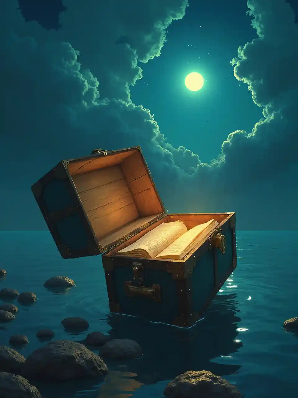ਇੱਕ ਖੁੱਲ੍ਹਾ ਭਾਫ ਵਾਲਾ ਟੈਂਕ ਜਿਸ ਵਿੱਚ ਜਾਦੂ ਦੀ ਕਿਤਾਬ ਹੈ। ਰਾਤ ਨੂੰ ਪਾਣੀ ਵਿੱਚ ਇਸ ਵਿੱਚ ਤੈਰਦੇ ਹੋਏ, ਅਸਮਾਨ ਵਿੱਚ ਇੱਕ ਚਮਕਦਾਰ ਗੋਲ, ਸਾਈਰਿਲ ਰੋਲੈਂਡੋ, ਜਾਦੂਈ ਯਥਾਰਥਵਾਦ, ਬਹੁਤ ਵਿਸਥਾਰ ਡਿਜੀਟਲ ਪੇਂਟਿੰਗ, ਇੱਕ ਵਿਸਥਾਰ ਮੈਟ ਪੇਂਟਿੰਗ