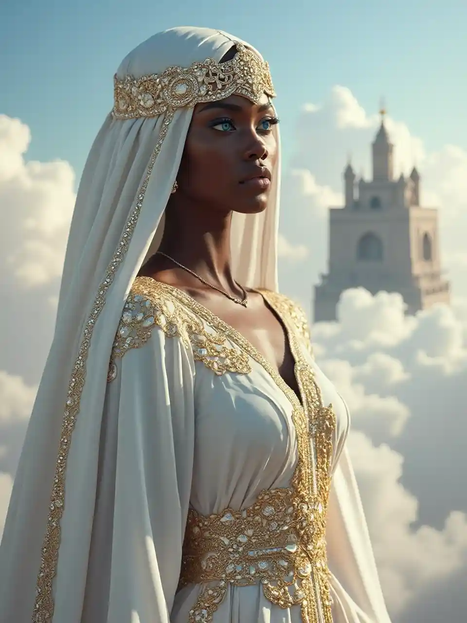ਇੱਕ ਅਰਬੀ ਕੱਪੜੇ ਅਤੇ ਹੀਰੇ ਦੇ ਮੂੰਹ ਦਾ ਪਰਦਾ ਪਹਿਨਣ ਵਾਲੀ ਇੱਕ ਸੁੰਦਰ ਅਫ਼ਰੀਕੀ ਔਰਤ ਰਾਈਟਰ। ਉਸ ਦੀਆਂ ਨੀਲੀਆਂ ਅੱਖਾਂ ਅਤੇ ਹਨੇਰੀ ਚਮੜੀ ਹੈ। ਚਿੱਟੇ ਅਤੇ ਸੋਨੇ ਦੇ ਗੁੰਝਲਦਾਰ ਪੈਟਰਨ ਪਹਿਨਣ ਵਾਲੇ ਔਰਤ ਇੱਕ ਪਵਿੱਤਰ ਕਿਲੇ ਦੇ ਸਾਹਮਣੇ ਖੜ੍ਹੀ ਹੈ ਜੋ ਅਕਾਸ਼ ਵਿੱਚ ਉੱਚਾ ਤੈਰ ਰਿਹਾ ਹੈ। ਬੱਦਲਾਂ ਦੇ ਉੱਪਰ ਉੱਚੇ ਉੱਚੇ ਪਠਾਰ। ਉਸ ਦੀ ਪੋਜ ਬਹੁਤ ਵਧੀਆ ਹੈ।