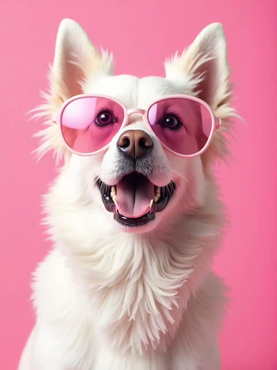 ਇੱਕ ਚਿੱਟੇ ਕੁੱਤੇ ਦਾ ਪੋਰਟਰੇਟ, ਗੁਲਾਬੀ ਸੂਰਜ ਦੀਆਂ ਅੱਖਾਂ, ਗੁਲਾਬੀ ਪਿਛੋਕੜ, ਚਮਕਦਾਰ ਰੰਗ