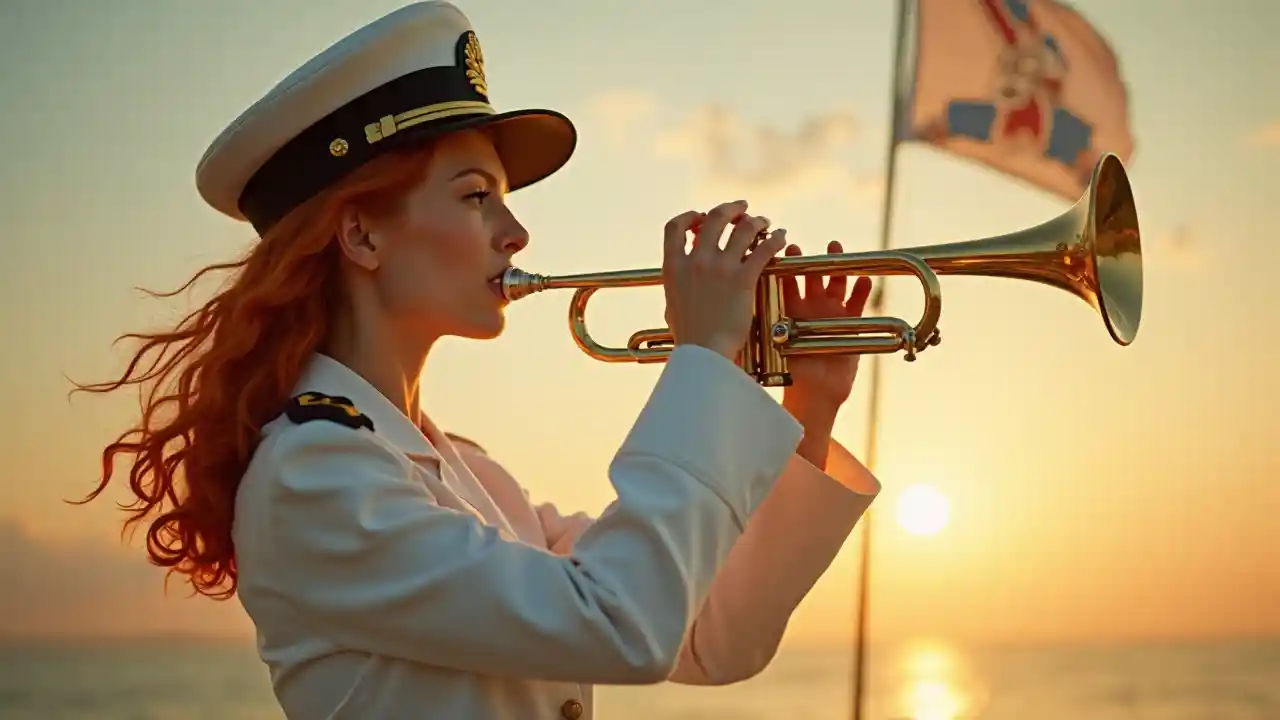 ਇੱਕ ਮਲਾਹ ਦੀ ਟੋਪੀ ਦੇ ਨਾਲ ਇੱਕ ਸੁੰਦਰ ਚਿੱਟੇ ਨੇਵਲ ਫੌਜੀ ਵਰਦੀ ਵਿੱਚ ਇੱਕ ਲਾਲ ਵਾਲ ਵਾਲੀ ਔਰਤ ਦੀ ਫੋਟੋ-ਯਥਾਰਥਵਾਦੀ ਤਸਵੀਰ, ਇੱਕ ਝੰਡਾ ਉਡਾਉਣ ਵਾਲੇ ਝੰਡੇ ਦੇ ਨਾਲ ਇੱਕ ਸੂਰਜ ਦੇ ਪਿਛੋਕੜ ਦੇ ਵਿਰੁੱਧ, ਇੱਕ ਤੂਰ ਚਲਾ ਰਿਹਾ ਹੈ, ਜੋ ਤਾਕਤ ਅਤੇ ਕਲਾਤਮਕਤਾ ਨੂੰ ਦਰਸਾਉਂਦਾ ਹੈ. ਸ਼ੁੱਧਤਾਵਾਦ ਅਤੇ ਡੀਜ਼ਲਪੰਕ ਸਟਾਈਲ ਵਿੱਚ ਫਸਿਆ, ਤਿੱਖੀ ਲਾਈਨਾਂ ਅਤੇ ਮਕੈਨੀਕਲ ਪ੍ਰਭਾਵਾਂ ਨੂੰ ਪ੍ਰਦਰਸ਼ਿਤ ਕਰਦਾ ਹੈ, ਵਿੰਸਟੇਕ ਅਤੇ ਗਤੀਸ਼ੀਲ ਊਰਜਾ ਨੂੰ ਦਰਸਾਉਂਦਾ ਹੈ, ਪਰੈਟੀ-ਵਿਸ਼ੇਸ਼ ਰਚਨਾ ਹਨੇਰੇ ਅਤੇ ਰੌਸ਼ਨੀ ਦੇ ਆਪਸੀ ਪ੍ਰਭਾਵ ਨੂੰ ਉਜਾਗਰ ਕਰਦੀ ਹੈ. @ਡੋਰਿਸਬੋਲਟਨਮੌਡ