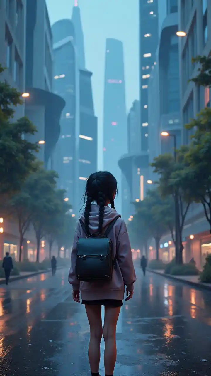 ਇੱਕ ਭਵਿੱਖਮੁਖੀ ਸ਼ਹਿਰ ਦੀ ਗਲੀ ਦੀ ਸੁਪਰ ਯਥਾਰਥਵਾਦੀ ਸ਼ੈਲੀ, ਸਟ੍ਰੀਮਲਾਈਨਜ਼, ਭਵਿੱਖਮੁਖੀ ਡਿਜ਼ਾਈਨ, ਕਰਵ ਲਾਈਨਾਂ, ਵਿਭਿੰਨ ਜ਼ਹਾ ਹਦੀ ਆਰਕੀਟੈਕਚਰ ਸ਼ੈਲੀ, ਰਾਤ, ਲਾਈਟਾਂ, ਸ਼ਹਿਰ ਦੇ ਪਾਰਕ, ਰੁੱਖ, ਇੱਕ ਲੜਕੀ, ਛੋਟਾ ਸਰੀਰ, ਵੱਡੀਆਂ ਨੀਲੀਆਂ ਅੱਖਾਂ, ਛੋਟੇ ਸੁੱਕੇ ਬੁੱਲ੍ਹੇ, ਕਪੜੇ ਵਿੱਚ ਕਾਲੇ ਵਾਲ, ((ਮਿਨੀ ਸਕਰਟ)), ((ਰ)), ((ਭਵਿੱਖਵਾਦੀ ਕੱਪੜੇ)), ((ਮੀਂ)), ((ਪੂਰਾ ਸਰੀਰ)), ((ਪੂਰਾ ਸਰੀਰ))