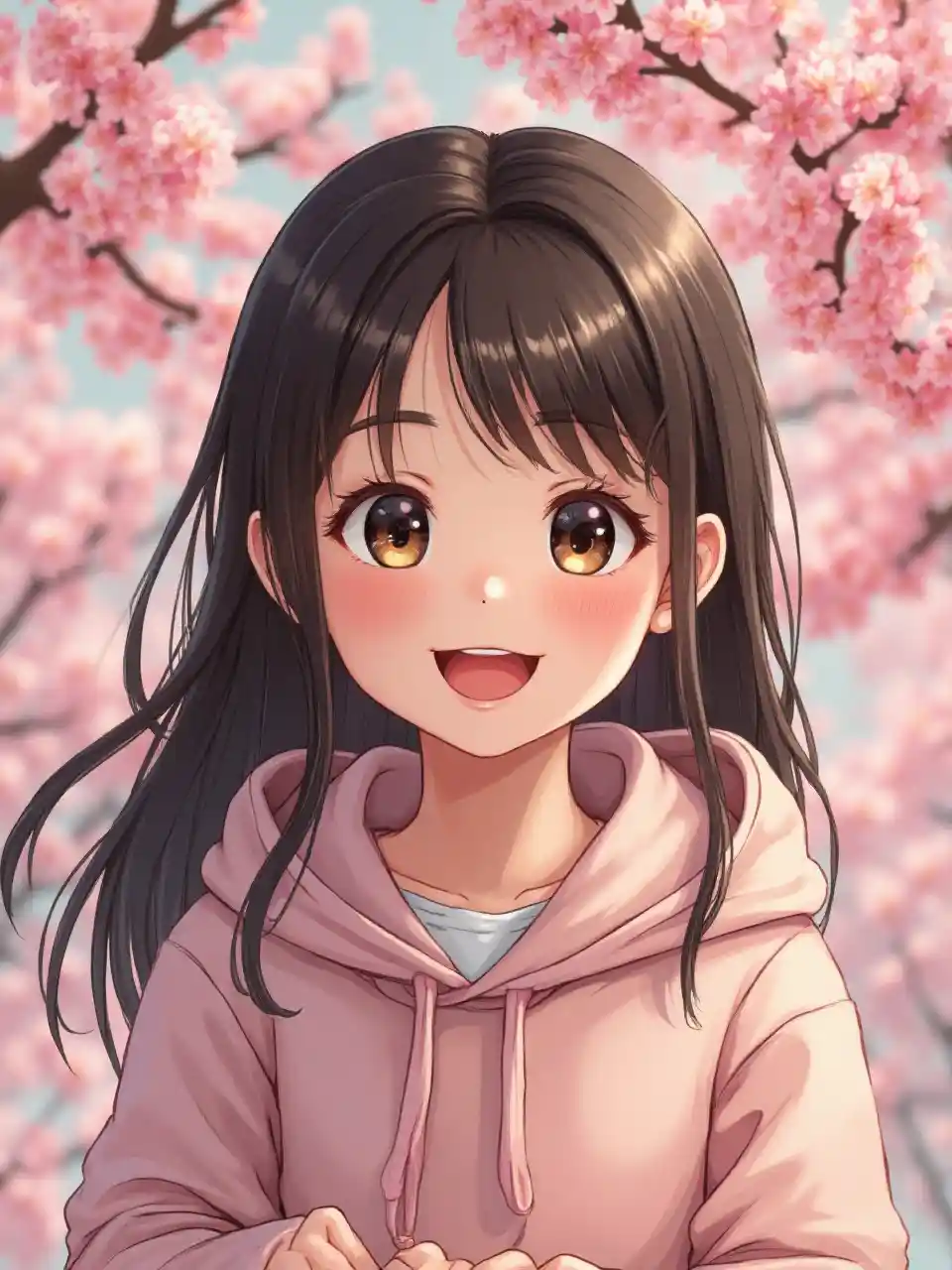 10 ਸਾਲ ਦੀ ਕੁੜੀ, ਮੁਸਕਰਾ ਰਹੀ ਹੈ, ਸਿੱਧੇ ਕੈਮਰੇ ਵਿੱਚ ਵੇਖ ਰਹੀ ਹੈ, ਚੈਰੀ ਫੁੱਲ ਪਿਛੋਕੜ, ਵਿਸਥਾਰ