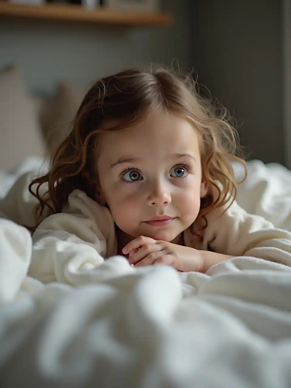 ਹਲਕੇ ਭੂਰੇ ਵਾਲਾਂ ਵਾਲੀ ਨੀਲੀ ਅੱਖ ਵਾਲੀ ਛੋਟੀ ਕੁੜੀ ਆਪਣੇ ਬਿਸਤਰੇ ਵਿੱਚ ਜਾਗ ਰਹੀ ਹੈ
