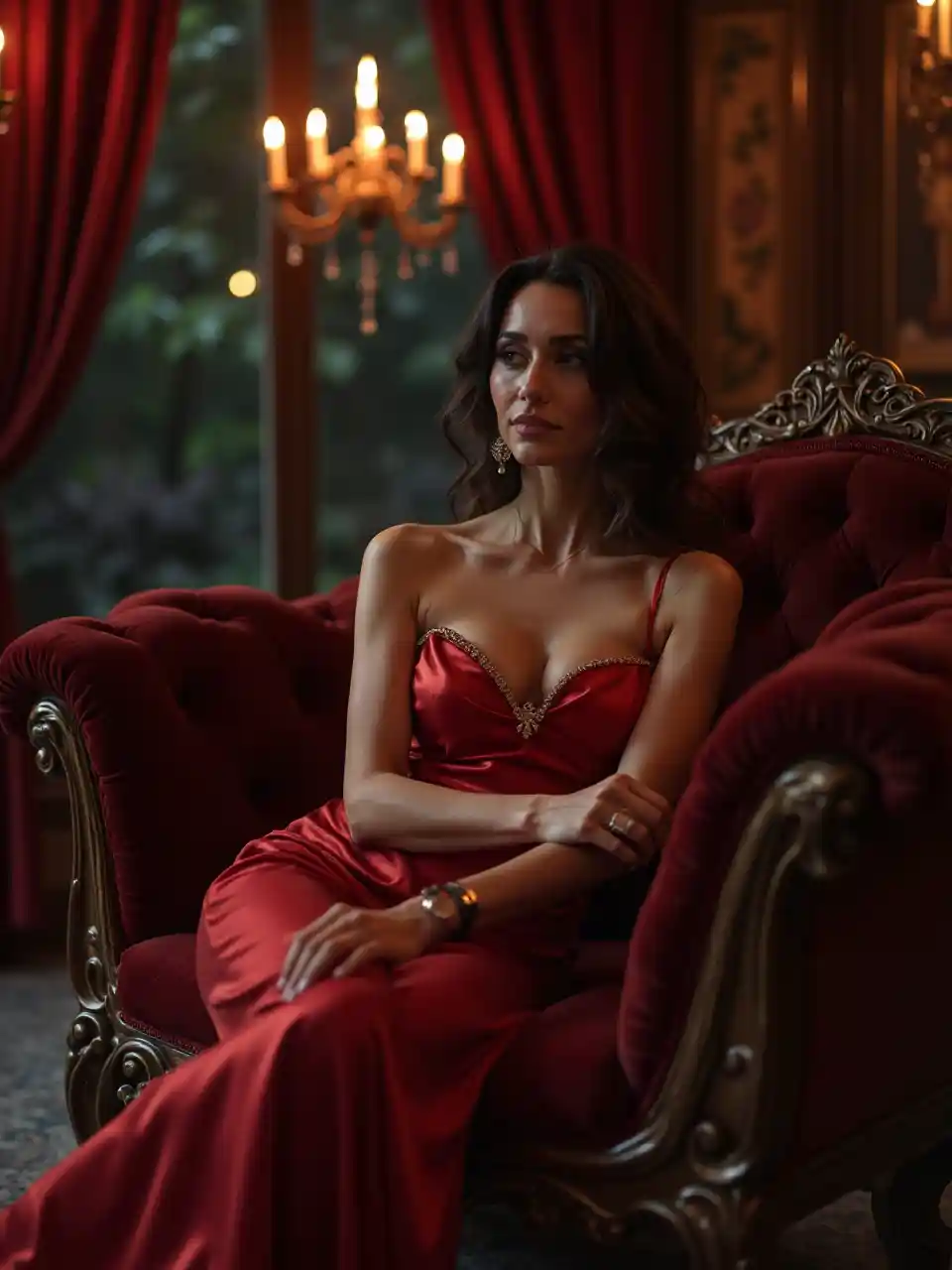 ਇੱਕ ਗੋਥਿਕ ਮੈਨਰ ਵਿੱਚ ਇੱਕ ਖਿਲਾਰੇ ਦੀ ਚੱਟੀ ਉੱਤੇ ਬੈਠੀ, ਇੱਕ ਮੱਧ ਪੂਰਬੀ ਔਰਤ 40 ਸਾਲ ਦੀ ਉਮਰ ਵਿੱਚ ਇੱਕ ਡੂੰਘੀ ਗਰਦਨ ਵਾਲੀ ਗੰਧਲਾ ਕੱਪੜੇ ਵਿੱਚ ਚਮਕਦੀ ਹੈ। ਮੋਮਬੱਤੀਆਂ ਦੇ ਚਾਨਣ ਅਤੇ ਲਾਲ ਰੰਗ ਦੇ ਪਰਦੇ ਉਸ ਨੂੰ ਫਰੇਮ ਕਰਦੇ ਹਨ, ਉਸ ਦੀਆਂ ਕਰਾਸ ਲੱਤਾਂ ਅਤੇ ਕਰਵਸੀ ਛਾਤੀ ਇੱਕ ਸ਼ਾਨਦਾਰ, ਰੋਮਾਂਟਿਕ ਸੈਟਿੰਗ ਵਿੱਚ ਸ਼ਾਹੀ ਸ਼ਾਨ ਅਤੇ ਸੁੰਦਰ ਸੰਜਮ ਨੂੰ ਪ੍ਰਕਾਸ਼ਿਤ ਕਰਦੀ ਹੈ।