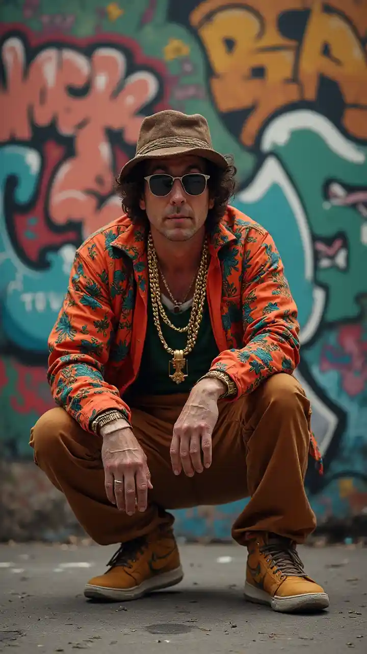 ਵਿਲ ਫੈਰਲ ਇੱਕ ਹਿੱਪ-ਹੌਪ ਆਈਕਨ ਬਣ ਗਿਆ, ਸੋਨੇ ਦੀ ਚੇਨ ਦਾ ਗਹਿਣਾ ਪਹਿਨ ਰਿਹਾ ਹੈ, 90 ਦੇ ਦਹਾਕੇ ਦੀ ਰੈਪ ਪੋਜ਼ ਵਿੱਚ ਕੁਰਬਾਨ ਹੋ ਰਿਹਾ ਹੈ, ਜੋ ਈ ਦੀ ਯਾਦ ਦਿਵਾਉਂਦਾ ਹੈ, ਜੋ ਕਿ ਗੁੰਝਲਦਾਰ ਗ੍ਰੈਫਟੀ ਕਲਾ, ਫੋਟੋ-ਯਥਾਰਥਵਾਦੀ ਸ਼ੈਲੀ ਨਾਲ ਭਰਿਆ ਹੋਇਆ ਹੈ, ਜੋ ਕਿ ਸ਼ਹਿਰੀ ਸਟ੍ਰੀਟ ਸਭਿਆਚਾਰ ਦਾ ਤੱਤ ਹੈ।