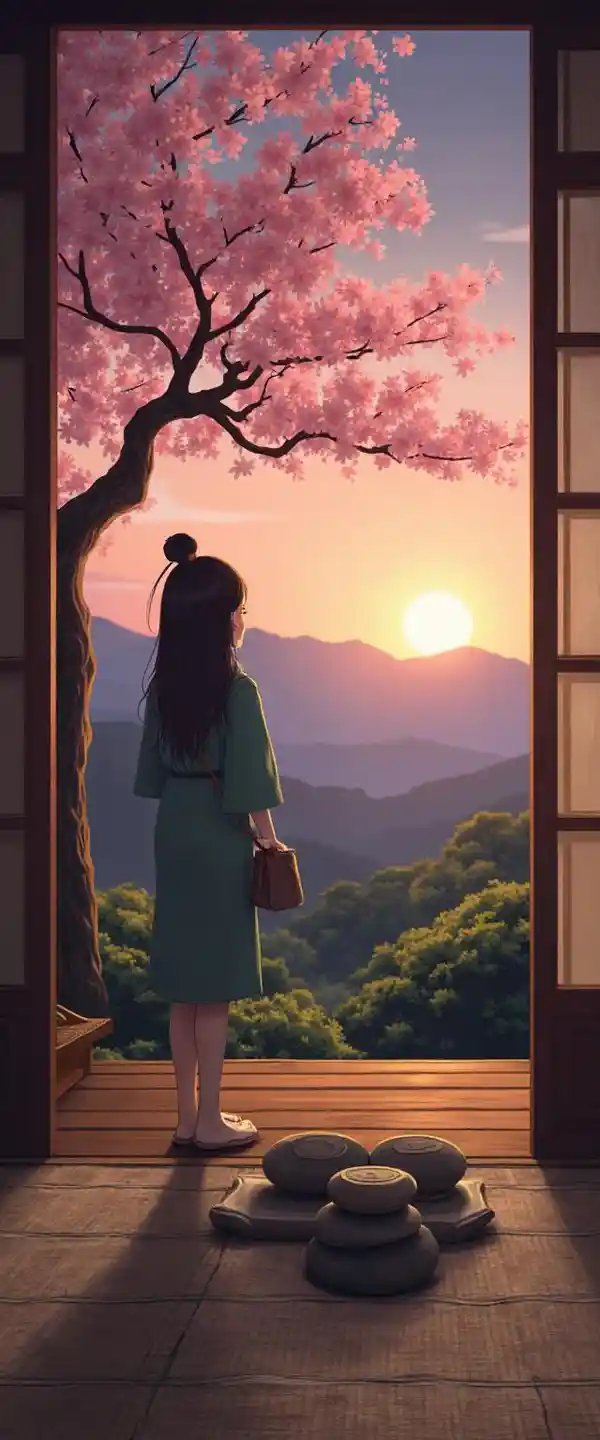 Chloeਸ਼ਾਮ ਨੂੰ ਇੱਕ ਸ਼ਾਂਤ ਜਪਾਨੀ ਬਾਗ਼, ਪਿਛੋਕੜ ਵਿੱਚ ਇੱਕ ਨਾਜ਼ੁਕ ਚੈਰੀ ਖਿੜਦਾ ਦਰੱਖਤ, ਸਾਹਮਣੇ ਇੱਕ ਰਵਾਇਤੀ ਟੈਟਾਮੈਟ ਕਮਰਾ, ਇੱਕ ਨੌਜਵਾਨ ਔਰਤ