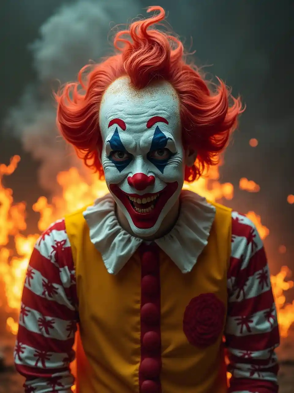 ਰੋਨਾਲਡ ਮੈਕਡੋਨਲਡ ਦਾ ਜੋਕਰ ਦਾ ਚਿਹਰਾ, ਉਸ ਦੀ ਪਿੱਠ ਪਿੱਛੇ ਧੂੰਆਂ ਅਤੇ ਅੱਗ