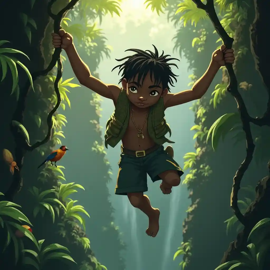 ਜੰਗਲ ਵਿੱਚ ਇੱਕ ਚਮਕਦਾਰ ਵੇਲ ਉੱਤੇ ਚੜ੍ਹਦੇ ਹੋਏ, ਇੱਕ 8 ਸਾਲਾ ਕਾਲਾ ਮੁੰਡਾ ਡ੍ਰੇਡਸ ਨਾਲ ਇੱਕ ਵੇਸਟ ਪਹਿਨਦਾ ਹੈ ਜਿਸ ਵਿੱਚ ਪੱਤੇ ਹੁੰਦੇ ਹਨ। ਵਿਦੇਸ਼ੀ ਪੰਛੀ ਅਤੇ ਧੁੰਦਲੇ ਝਰਨੇ ਉਸ ਨੂੰ ਫਰੇਮ ਕਰਦੇ ਹਨ, ਉਸ ਦੀ ਦਲੇਰੀ ਨਾਲ ਸਾਹ ਅਤੇ ਇੱਕ ਸ਼ਾਨਦਾਰ ਸੈਟਿੰਗ ਵਿੱਚ ਜੰਗਲੀ ਸਾਹ.