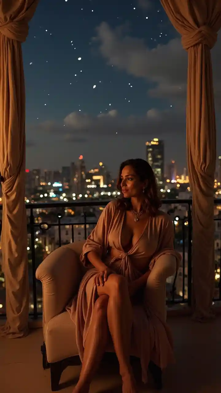 Lounging on a silk-draped balcony, a Middle Eastern woman in her 35s shines in a plunging kaftan. City lights and starry skies frame her, her crossed legs and accentuated chest radiating luxurious allure and seductive elegance in an intimate, urban setting.