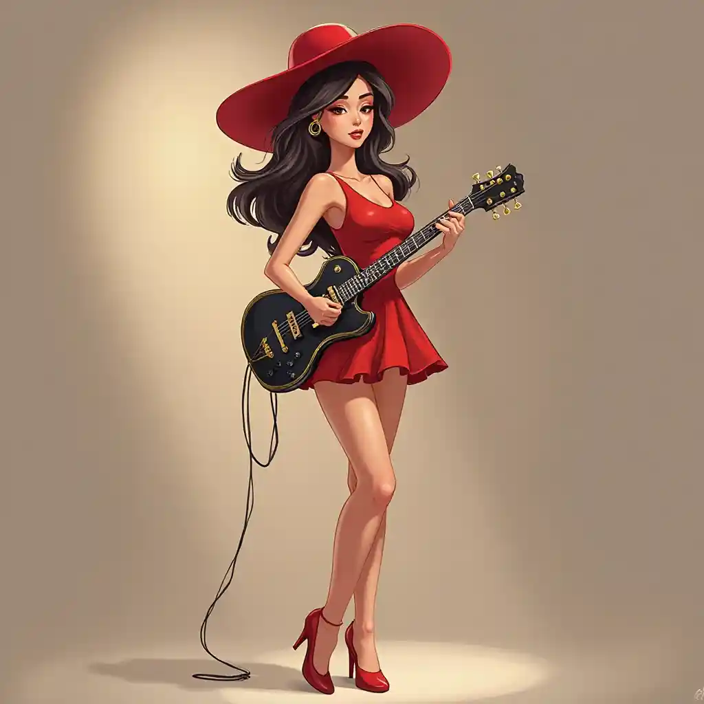 ਇੱਕ ਆਧੁਨਿਕ ਅਤੇ ਸੁੰਦਰ ਲੜਕੀ ਕਲਾਤਮਕ ਅਹਿਸਾਸ ਅਤੇ ਸੁੰਦਰ ਸ਼ਕਲ ਨਾਲ ਖਿੱਚੀ ਗਈ ਸੀ ਜਿਸ ਵਿੱਚ ਲਾਲ ਟੋਪੀ ਅਤੇ ਸਲੀਵਜ਼ ਅਤੇ ਸੋਨੇ ਦੀਆਂ ਗੱਤੀਆਂ ਅਤੇ ਉੱਚੀਆਂ ਗੱਦੀਆਂ ਵਾਲੀਆਂ ਮਿੰਨੀ ਸਕਰਟਾਂ ਸਨ, ਇੱਕ ਨਰਮ ਪਿਛੋਕੜ, ਪੂਰੇ ਸਰੀਰ ਦੇ ਨਾਲ ਇਲੈਕਟ੍ਰਾਨਿਕ ਗਿਟਾਰ ਦੇ ਨਾਲ ਰੌਕ ਐਂਡ ਰੋਲ ਸੰਗੀਤ