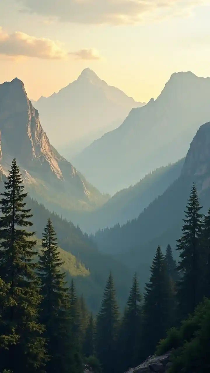 A breathtaking vista unfolds with majestic mountains rising against a soft, hazy sky, where gentle clouds drift lazily amidst the warm golden light of late afternoon. Layers of rugged peaks form a dramatic backdrop, their silhouettes softened by atmospheric perspective, while a dense forest of lush evergreens sprawls across the foreground, adding rich contrasts of deep greens. The serene ambiance evokes a sense of tranquility, inviting viewers to immerse themselves in nature’s splendor, as the interplay of light and shadow highlights the geological textures of the landscape. This harmonious scene captures the beauty of wilderness, emphasizing a timeless narrative of peace and solitude amidst towering heights. Blocks of matte primary colours, browns, mustard yellow, light blue, dark green.