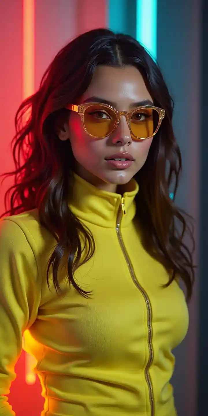 (ਨੈਓਨ ਲਾਲ ਗਲਾਸ ਨਾਲ ਲਾਈਟਾਂ ਦੇ ਨਾਲ ਮੋਢੇ ਤੱਕ ਵਾਲ, ਮੈਂ ਮਹਿਸੂਸ ਕਰਦਾ ਹਾਂ ਕਿ ਗਲਾਸ ਦੇ ਲੈਂਸ ਅਤੇ ਇੱਕ ਪਾਰਦਰਸ਼ੀ ਪ੍ਰਤੀਬਿੰਬ ਪੀਲੇ, ਜੰਪਸੁਟ ਗਲਾਸ