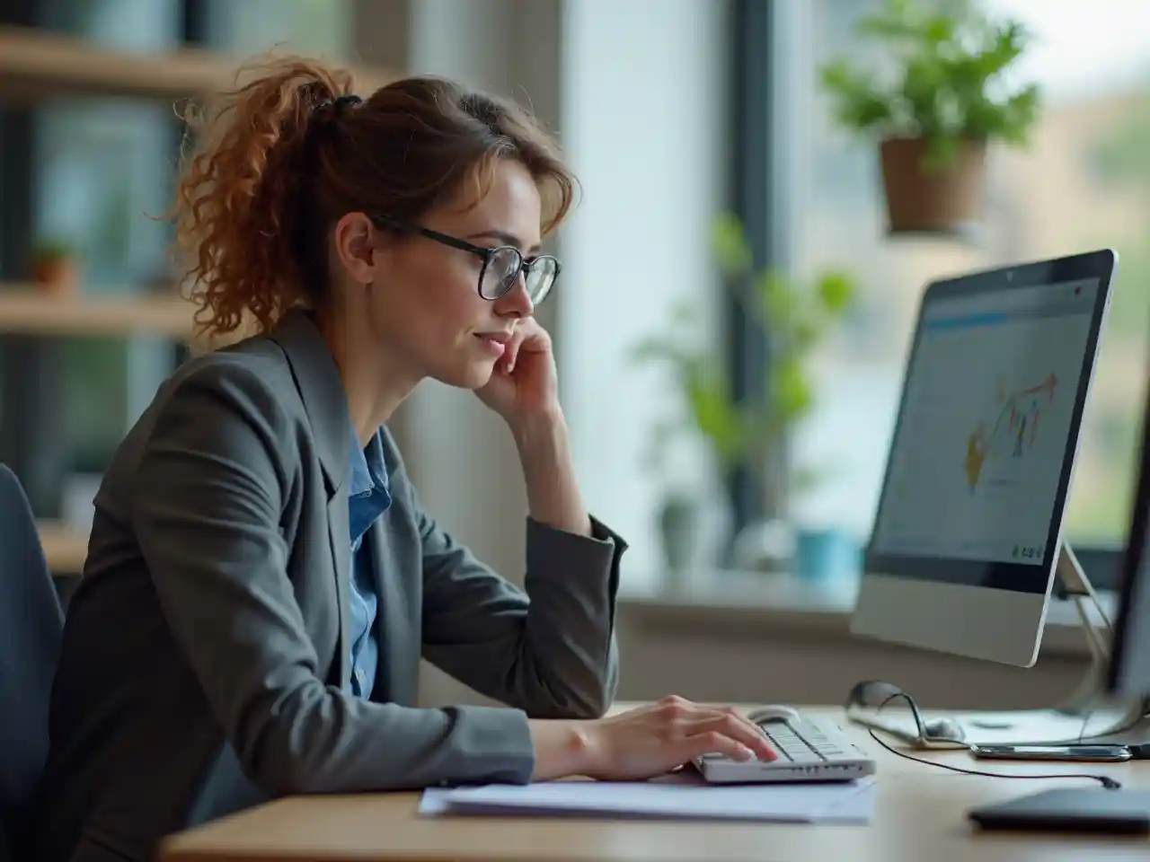 ਉਸ ਦੇ ਕੰਪਿਊਟਰ ਡੈਸਕਟਾਪ 'ਤੇ ਕੰਮ ਕਰ ਰਹੀ ਉੱਦਮੀ ਨੇ ਚਸ਼ਮੇ ਅਤੇ ਇੱਕ ਸੂਟ ਪਹਿਨ ਕੇ ਆਪਣੇ ਡਿਜੀਟਲ ਉਤਪਾਦਾਂ ਦੀ ਪ੍ਰਸ਼ੰਸਾ ਕੀਤੀ