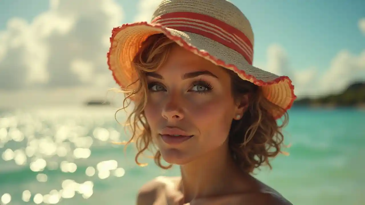 Jonathan1950 ਦੇ ਦਹਾਕੇ ਦੀ ਇੱਕ ਪਿੰਨ-ਅੱਪ ਕੁੜੀ ਸ਼ੈਲੀ, ਸੁੰਦਰ ਸੁਪਰ ਮਾਡਲ ਚਿਹਰਾ ਸਮਾਨ, ਸਿਨੇਮਾ ਦੀ ਸ਼ਾਟ, ਨਾਟਕੀ, ਨਾਟਕੀ ਰੋਸ਼ਨੀ, ਬੀਚ ਬੇਬੀ, ਪਾਣੀ ਵਿੱਚ ਖੜ੍ਹੇ ਸੰਪੂਰਨ ਚਿੱਤਰ, ਰੰਗ ਦੀ ਟੋਪੀ, ਰੇਖਾ ਦੀ ਸ਼ਾਟ