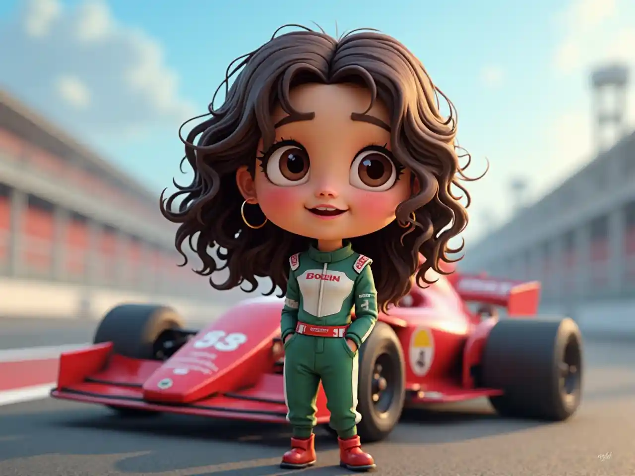 3D ਐਨੀਮੇਟਡ ਕਿਰਦਾਰਾਂ ਨਾਲ ਪਿਕਸਰ ਦੀ ਸ਼ੈਲੀ ਵਿੱਚ ਖੂਬਸੂਰਤ ਚਿਬੀ ਕੁੜੀ ਸਿਰਲੇਖ ਹੈ 'ਸੋਫੀਆ' ਅਤੇ ਲੰਬੇ ਘੁੰਮਦੇ ਹਨੇਰੇ ਰੰਗ ਦੇ ਵਾਲਾਂ ਵਾਲੀ ਇੱਕ ਕੁੜੀ ਨੂੰ ਦਰਸਾਉਂਦਾ ਹੈ, ਭੂਰੇ ਅੱਖਾਂ, ਹਨੇਰਾ ਹਰੀ ਚਿੱਟੇ ਅਤੇ ਲਾਲ ਰੇਸਿੰਗ ਸੂਟ, 1 ਕਾਰ ਪਿਛੋਕੜ, ਸਪੀਡਵੇ, F1, ਪੋਸਟਰ