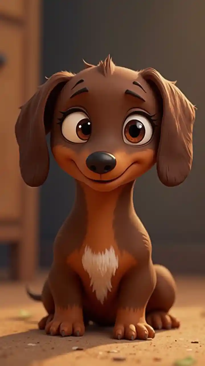 ਇੱਕ ਚਾਕਲੇਟ ਭੂਰੇ ਡੈਸ਼ਸ਼ੁਡ, ਵੱਡੀ ਭੂਰੇ ਅੱਖਾਂ, ਫਲਾਪੀ ਕੰਨਾਂ ਅਤੇ ਚਿੱਟੇ ਛਾਤੀ ਦੇ ਨਾਲ, ਇੱਕ ਪਿਕਸਰ ਫਿਲਮ ਦੇ ਸ਼ੈਲੀ ਵਿੱਚ