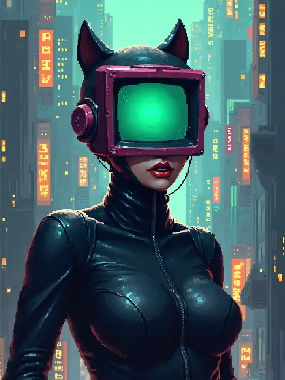 ਚਮੜੇ ਦੇ ਸੂਟ ਵਿੱਚ ਇੱਕ ਗੁਲਾਬੀ ਨਾਲ Catwoman ਸਿਰ ਦੀ ਜਗ੍ਹਾ ਇੱਕ ਟੀ ਵੀ ਹੈ . ਸ਼ਹਿਰ ਦੇ ਪਿਛੋਕੜ ਵਿੱਚ ਜੋ ਕਿ ਸਮਾਰਡ, ਪਿਕਸਲ ਸ਼ੈਲੀ, ਬਲਾਕ, ਰੌਸ਼ਨੀ ਰੰਗ, ਸਪੱਸ਼ਟ ਵੇਰਵੇ