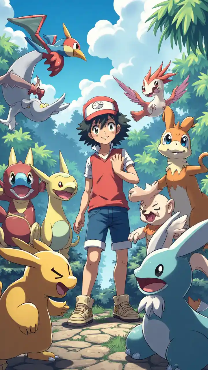 ਐਸ਼ ਕੇਚਮ ਦੇ ਆਲੇ ਦੁਆਲੇ ਰੰਗੀਨ ਪੋਕੇਨ ਅੱਖਰਾਂ ਦੇ ਨਾਲ ਇੱਕ ਜੀਵੰਤ ਦ੍ਰਿਸ਼