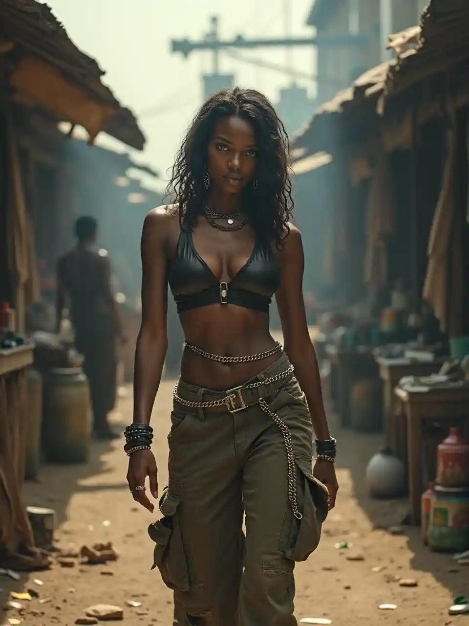 ਇੱਕ ਪੋਸਟ-ਅਪੋਕਲਿਪਟਿਕ ਬਾਜ਼ਾਰ ਵਿੱਚ ਘੁੰਮਦੀ ਇੱਕ 25 ਸਾਲ ਦੀ ਕਾਲੇ ਔਰਤ ਚਮੜੇ ਦੇ ਟੌਪ ਅਤੇ ਚੇਨ ਬੈਲਟ ਨਾਲ ਕਾਰਗ ਪੈਂਟ ਵਿੱਚ ਮਨਮੋਹਕ ਹੈ। ਖੋਰਦਾਰ ਸਟਾਲ ਅਤੇ ਧੂੰਏਂ ਵਾਲੀ ਹਵਾ ਉਸ ਨੂੰ ਫਰੇਮ ਕਰਦੀ ਹੈ, ਉਸ ਦੀਆਂ ਟੋਨਡ ਲੱਤਾਂ ਅਤੇ ਡੁੱਬਣ ਵਾਲੀ ਗਰਦਨ ਇੱਕ ਡਿਸਪੋਨੀ, ਹਫ ਦ੍ਰਿਸ਼ ਵਿੱਚ ਗੰਧਕ ਸੁਹਜ ਅਤੇ ਬਾਗੀ ਭਾਵਨਾ ਨੂੰ.