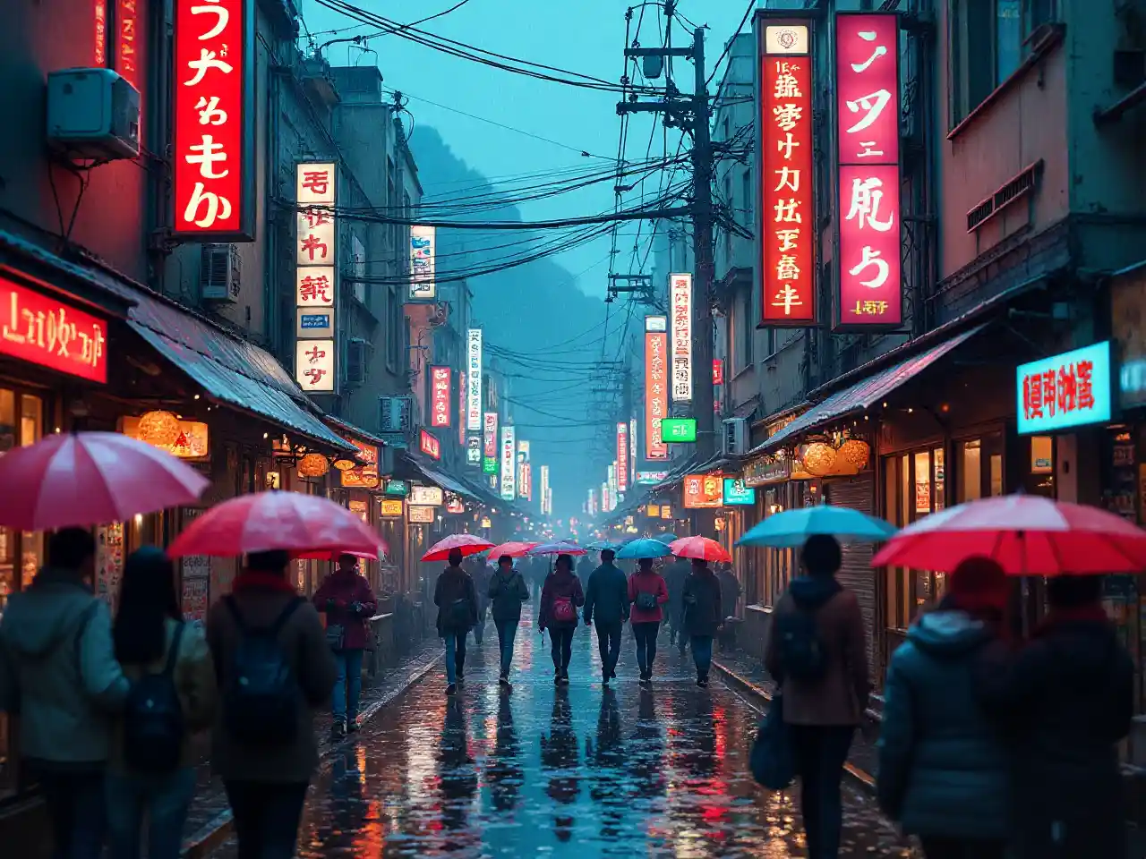 ਜਾਪਾਨੀ ਸ਼ਹਿਰ ਦੀ ਗਲੀ, ਬਾਰਸ਼ ਵਿੱਚ ਚੱਲ ਰਹੇ ਲੋਕ, ਚਮਕਦਾਰ ਛੱਤਰੀਆਂ, ਇਮਾਰਤਾਂ ਨੂੰ ਪ੍ਰਕਾਸ਼ਮਾਨ ਕਰਨ ਵਾਲੇ ਨੀਓਨ ਸਾਈਨਾਂ, ਆਈ-ਮਿਤਸੂ ਅਤੇ ਰੇਯੋਨਿਜ਼ਮ ਸਟਾਈਲ ਦਾ ਇੱਕ ਸੁਮੇਲ, ਸਾਈਬਰਪੰਕ ਕਲਾ ਦੇ ਤੱਤ ਨੂੰ ਦਰਸਾਉਂਦਾ ਹੈ, ਮੀਂਹ ਦੀਆਂ ਬੂੰਦਾਂ ਦਾ ਇੱਕ ਮੂਵੀ ਮਾਹੌਲ ਬਣਾਉਂਦਾ ਹੈ, ਹਰ ਵਿਸਥਾਰ ਵਿੱਚ ਉੱਚ ਤਣਾਅ, ਅਲਟਰਾ-ਡੈਟੇਡ, ਸਿਨੇਮੈਟਿਕ ਰੋਸ਼ਨੀ, ਬਰਫ ਦੇ ਪੈਣ ਵਾਲੇ ਤੇ ਚਮਕਦਾਰ ਰੰਗਾਂ ਨੂੰ ਦਰਸਾਉਂਦੀ ਹੈ।