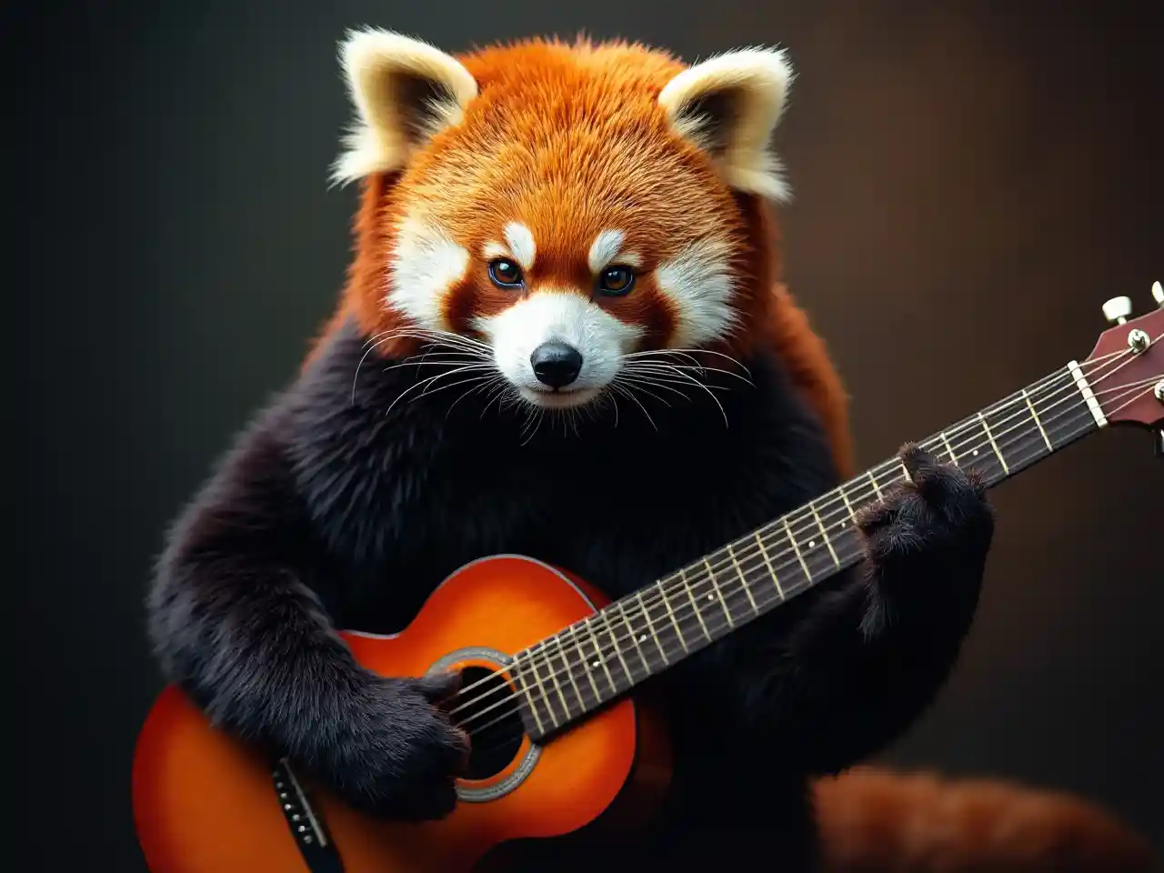 Lunaਗਿਟਾਰ ਵਜਾਉਂਦੇ ਲਾਲ ਪਾਂਡਾ, ਸਪਸ਼ਟ ਰੰਗ, ਵਿਰੋਧੀ ਰੋਸ਼ਨੀ, ਸਟੂਡੀਓ ਫੋਟੋ, ਪੇਸ਼ੇਵਰ ਫੋਟੋ, ਵਿਸਤ੍ਰਿਤ ਚਿੱਤਰ, ਵਿਸਤ੍ਰਿਤ ਚਿਹਰਾ