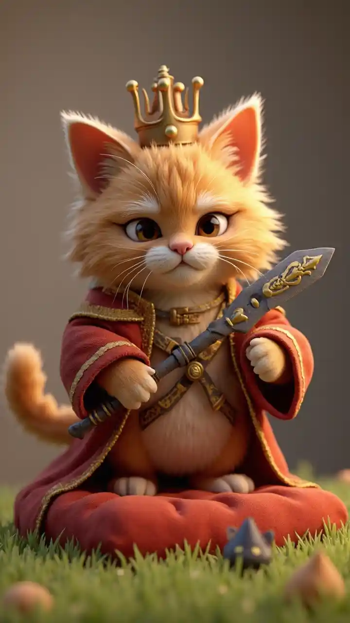 ਕਲੇਸ਼ ਆਫ਼ ਕਲੇਨਜ਼ ਦੀ ਸ਼ੈਲੀ ਵਿੱਚ ਖਿਡੌਣਾ ਹਥਿਆਰਾਂ ਨਾਲ ਹਥਿਆਰਬੰਦ ਇੱਕ ਮਜ਼ਾਕੀਆ ਪਿਆਰੀ ਫ਼ਾਰਸੀ ਬਿੱਲੀ ਦਾ ਇੱਕ 3D ਰੈਂਡਰ. ਇੱਕ ਤਾਜ ਦੇ ਨਾਲ ਇੱਕ ਸ਼ਾਹੀ ਖਜ਼ਾਨਾ ਪਹਿਨਣਾ ਅਤੇ ਖਜ਼ਾਨਾ ਦੇ ਸਿਰ ਬੈਠਣਾ, ਮਾਣ ਨਾਲ ਪਰ ਥੋ ਗੁੱਸੇ ਨਾਲ। ਇਹ ਆਪਣੀ ਲੱਕੜ ਨੂੰ ਢਾਲ ਵਜੋਂ ਵਰਤਦਾ ਹੈ ਅਤੇ ਸ਼ਾਂਤ ਕਰਨ ਵਾਲੇ ਮੂੰਹ ਕੱਢਦਾ ਹੈ ਜੋ ਵਿਰੋਧੀਆਂ ਨੂੰ ਹੈਰਾਨ ਕਰ ਸਕਦਾ ਹੈ। ਕੁਝ ਖਿੰਡੇ ਹੋਏ ਬਿੱਲੀ ਦੇ ਖਿਡੌਣੇ ਸ਼ਾਮਲ ਕਰੋ. ਕੱਟੇ ਹੋਏ ਘਾਹ ਦੇ ਟੁਕੜੇ ਉੱਤੇ ਖੜ੍ਹਾ, ਨਰਮ ਰੰਗ ਦਾ ਪਿਛੋਕੜ, ਫੋਟੋ-ਯਥਾਰਥਵਾਦੀ, ਪਿਕਸਰ ਸ਼ੈਲੀ