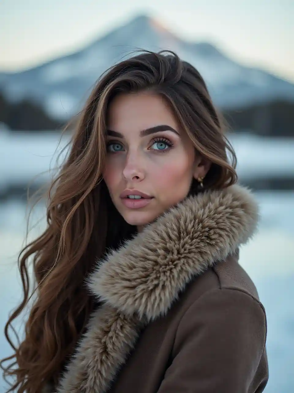 FINNNਸੁੰਦਰ ਰੋਮਾਨੀਆ ਦੀ ਇੱਕ ਸੁੰਦਰ ਔਰਤ ਦਾ ਮੈਕਅਪ ਅਤੇ ਫਰ ਜੈਕਟ, ਖੇਤਰ ਦੀ ਡੂੰਘਾਈ, ਪਿਛੋਕੜ ਦੇ ਤੌਰ ਤੇ ਬਰਫੀਲੇ ਪਹਾੜਾਂ ਦਾ ਅਸਲ ਪੋਰਟਰੇਟ
