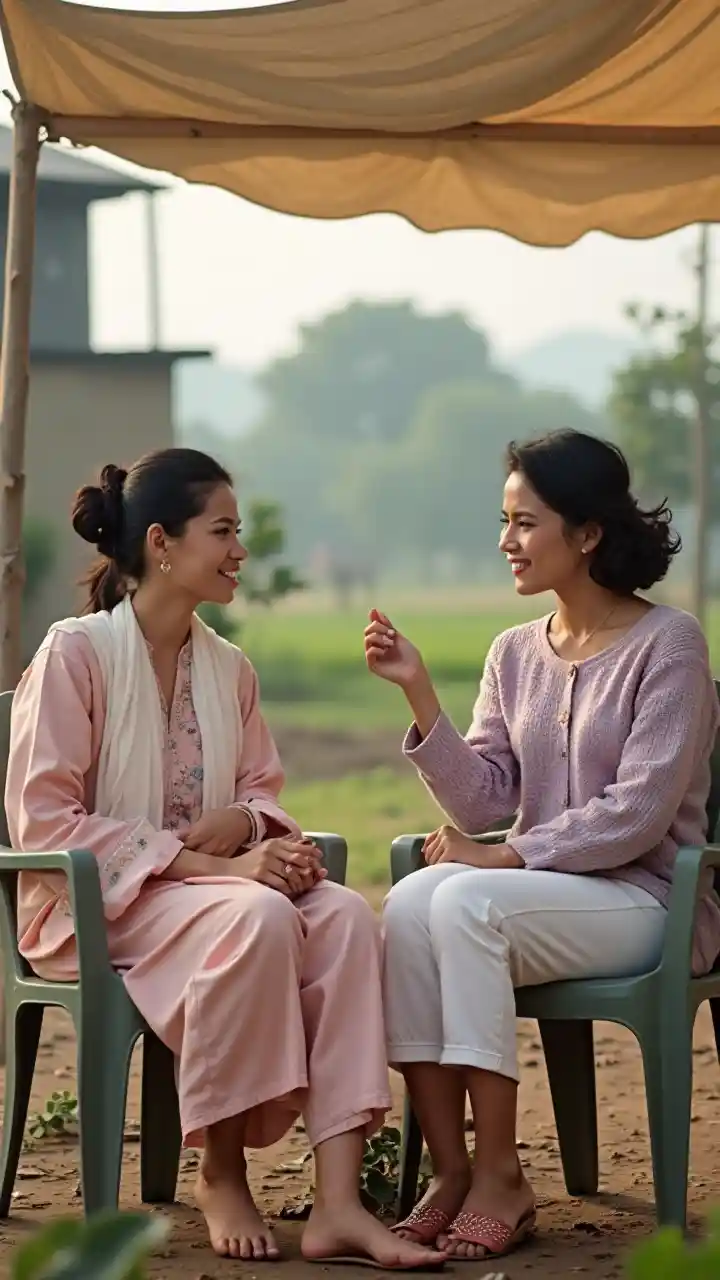 ਇੱਕ ਸੁਖਦ ਬਾਹਰੀ ਮਾਹੌਲ ਵਿੱਚ, ਦੋ ਔਰਤਾਂ ਪਲਾਸਟਿਕ ਦੀਆਂ ਕੁਰਸੀਆਂ ਉੱਤੇ ਆਰਾਮ ਨਾਲ ਬੈਠੀਆਂ ਹਨ। ਖੱਬੇ ਪਾਸੇ ਦੀ ਔਰਤ, ਇੱਕ ਨਰਮ ਗੁਲਾਬੀ ਕੱਪੜੇ ਵਿੱਚ ਸਜਾਇਆ ਗਿਆ ਹੈ ਅਤੇ ਇੱਕ ਚਿੱਟੇ ਸਕਾਰ ਵਿੱਚ ਢਕਿਆ ਹੋਇਆ ਹੈ, ਗੱਲਬਾਤ ਵਿੱਚ ਸ਼ਾਮਲ ਹੈ, ਉਸ ਦੇ ਚਿਹਰੇ ਸੋਚ. ਇਸ ਦੌਰਾਨ ਸੱਜੇ ਪਾਸੇ ਦੀ ਔਰਤ, ਜੋ ਕਿ ਇੱਕ ਹਲਕੇ ਜਾਮਨੀ ਅਤੇ ਚਿੱਟੇ ਸਵੈਟਰ ਅਤੇ ਚਿੱਟੇ ਪੈਂਟ ਨਾਲ ਜੁੜੀ ਹੈ, ਇੱਕ ਹੱਥ ਚੁੱਕ ਬੈਠੀ ਹੈ, ਸ਼ਾਇਦ ਗੱਲਬਾਤ ਦੇ ਮੱਧ ਵਿੱਚ ਇਸ਼ਾਰਾ ਕਰ ਰਹੀ ਹੈ। ਪਿਛੋਕੜ ਵਿੱਚ ਹਰੇ-ਹਰੇ ਅਤੇ ਇੱਕ ਅੰਸ਼ਕ ਤੌਰ ਤੇ ਬਣਾਈ ਗਈ ਇਮਾਰਤ ਦਾ ਮਿਸ਼ਰਣ ਪ੍ਰਗਟ ਹੁੰਦਾ ਹੈ, ਜੋ ਇੱਕ ਨਰਮ ਦਿਨ ਦੀ ਰੌਸ਼ਨੀ ਨਾਲ ਨਜਿੱਠਦਾ ਹੈ. ਰੌਸ਼ਨੀ ਅਤੇ ਰੰਗਾਂ ਦੇ ਸੁਮੇਲ ਨਾਲ ਇਹ ਤਸਵੀਰ ਸ਼ਾਂਤ ਖੇਤਰੀ ਨਜ਼ਾਰੇ ਵਿੱਚ ਆਰਾਮ ਅਤੇ ਸਬੰਧ ਦੀ ਭਾਵਨਾ ਨੂੰ ਪ੍ਰਗਟ ਕਰਦੀ ਹੈ।
