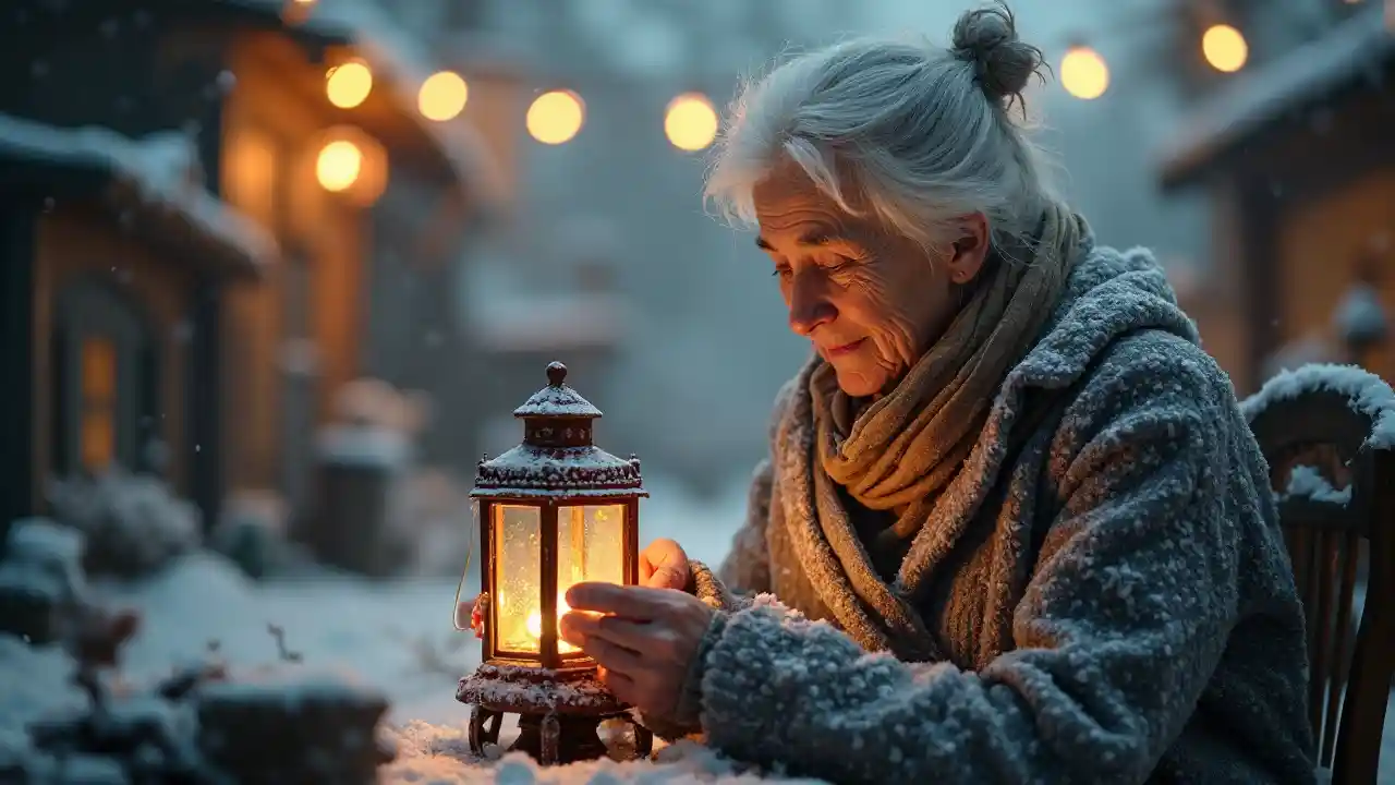 Crafting a lantern in a snowy village, a 82-year-old White woman with a scarf wears a coat with snowflake embroidery. Twinkling lights and frosted pines frame her, her careful folds radiating warmth and festive charm in a cozy, wintery setting. Her hands glow with care.