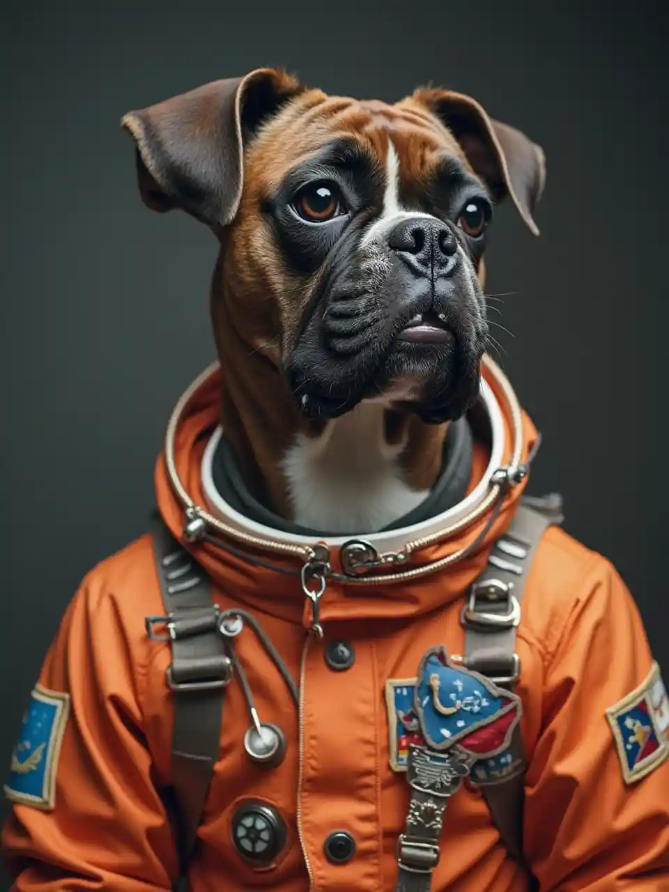 ਪੁਲਾੜ ਸੂਟ ਵਿੱਚ ਮੁੱਕੇਬਾਜ਼ ਕੁੱਤਾ