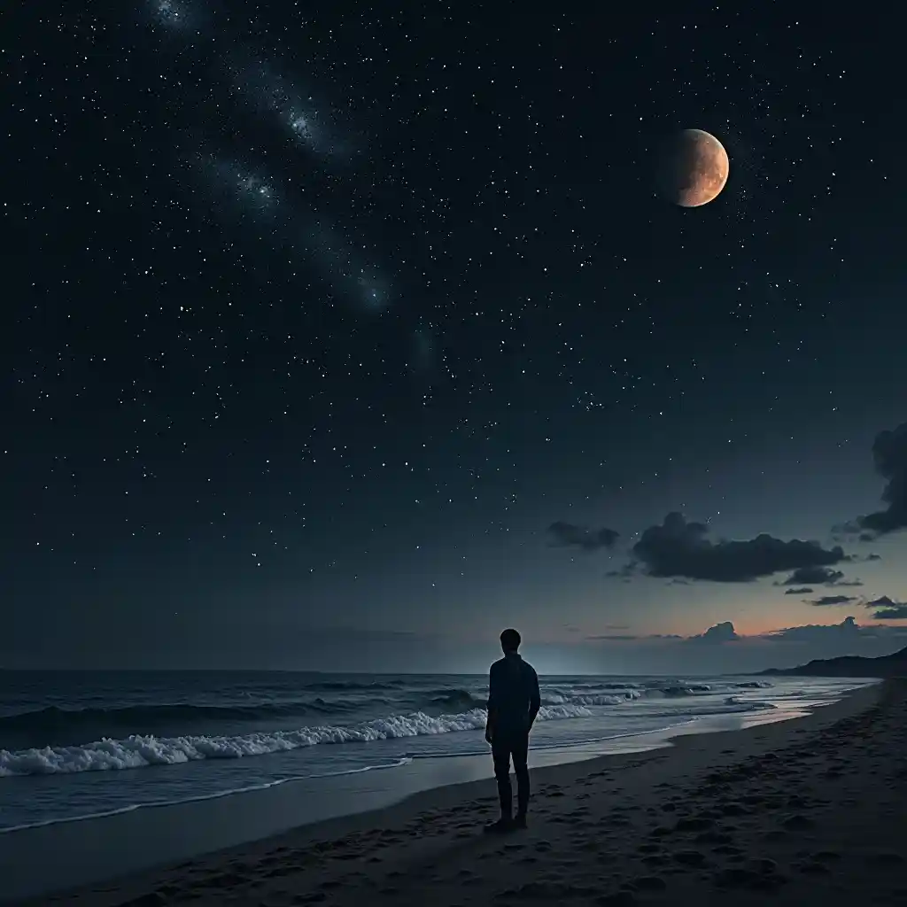ਇੱਕ ਸਮੁੰਦਰੀ ਕੰਢੇ ਦੇ ਕੰਢੇ ਇੱਕ ਆਦਮੀ ਦੀ ਤਸਵੀਰ ਜੋ ਤਾਰਿਆਂ ਅਤੇ ਗ੍ਰਹਿਆਂ ਨਾਲ ਭਰੇ ਅਸਮਾਨ ਨੂੰ ਵੇਖਦੀ ਹੈ। ਇਸਨੂੰ ਏ ਦੁਆਰਾ ਤਿਆਰ ਕੀਤਾ ਗਿਆ ਹੈ ਅਤੇ ਇਸ ਨੂੰ ਕਾਲੇ ਪਿਛੋਕੜ ਤੇ ਤਾਰੇ ਦੁਆਰਾ ਤਿਆਰ ਕੀਤਾ ਗਿਆ ਹੈ.