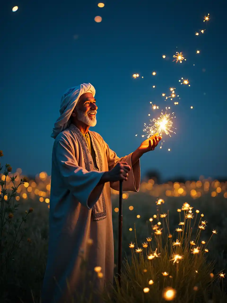 ਇੱਕ 80 ਸਾਲਾ ਮੱਧ ਪੂਰਬੀ ਆਦਮੀ ਇੱਕ ਸਟਾਰਡ ਮੈਦਾਨ ਵਿੱਚ ਲਾਲਚ ਫੜ ਰਿਹਾ ਹੈ, ਇੱਕ ਸਟਾਰਡ ਪੈਚ ਵਾਲਾ ਇੱਕ ਕੱਪੜਾ ਪਹਿਨ ਰਿਹਾ ਹੈ। ਜੰਗਲੀ ਫੁੱਲਾਂ ਅਤੇ ਚਮਕਦਾਰ ਅਸਮਾਨਾਂ ਨੇ ਉਸ ਨੂੰ ਫਰੇਮ ਕੀਤਾ, ਉਸ ਦੇ ਨਰਮ ਚੂਚੇ ਇੱਕ ਸੁਪਨੇ ਵਾਲੀ ਕੁਦਰਤ ਵਿੱਚ ਹੈਰਾਨੀ ਅਤੇ ਅਨੰਦ ਦੀ ਕਿਰਿਆ ਕਰਦੇ ਹਨ। ਉਸ ਦੀ ਮੁਸਕਾਨ ਰਾਤ ਨੂੰ ਰੌਸ਼ਨ ਕਰਦੀ ਹੈ।