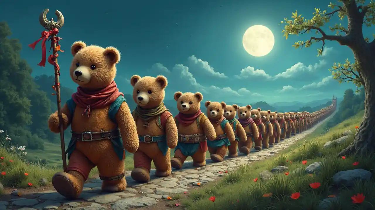 ਚੰਦ ਦੀ ਰੌਸ਼ਨੀ ਵਾਲੇ ਅਸਮਾਨ ਦੇ ਹੇਠਾਂ ਦ੍ਰਿੜਤਾ ਨਾਲ ਚਮਕਦੇ ਹੋਏ, ਚੁੰਨੀ ਦੀਆਂ ਅੱਖਾਂ ਨਾਲ, ਚੁੰਨੀ ਦੀਆਂ ਅੱਖਾਂ ਨਾਲ, ਚੁੰਨੀ ਦੀਆਂ ਅੱਖਾਂ ਨਾਲ, ਚੁੰਨੀ ਦੀਆਂ ਅੱਖਾਂ ਨਾਲ, ਚੁੰਨੀ ਦੀਆਂ ਅੱਖਾਂ ਨਾਲ, ਚੁੰਨੀ ਦੀਆਂ ਅੱਖਾਂ ਨਾਲ, ਚੁੰਨੀ ਦੀਆਂ ਅੱਖਾਂ ਨਾਲ, ਚੁੰਨੀ ਦੀਆਂ ਅੱਖਾਂ ਨਾਲ, ਚੁੰਨੀ ਇਹ ਦ੍ਰਿਸ਼ ਇਕਮੁੱਠਤਾ ਦੀ ਇੱਕ ਹਵਾ ਨਾਲ ਪ੍ਰਗਟ ਹੁੰਦਾ ਹੈ ਜਦੋਂ ਰਿੱਛ, ਨਾ-ਜੁਕਵੇਂ, ਧਿਆਨ ਨਾਲ ਸਿਲਾਈ ਕੀਤੇ ਰੰਗ ਦੇ ਬਖਤਰਾਂ ਨਾਲ, ਕੋਮਲ ਪਹਾੜੀਆਂ ਅਤੇ ਉੱਚੇ ਦਰੱਖਤਾਂ ਦੇ ਨਜ਼ਾਰੇ ਨਾਲ ਜਾਂਦੇ ਹਨ. ਉਨ੍ਹਾਂ ਦੇ ਨਰਮ ਪੈਰਾਂ ਦਾ ਹਰ ਕਦਮ ਉਨ੍ਹਾਂ ਦੀ ਦ੍ਰਿੜ੍ਹ ਭਾਵਨਾ ਨਾਲ ਗੂੰਜਦਾ ਹੈ। ਇਸ ਸ਼ਾਨਦਾਰ ਤਸਵੀਰ ਦੇ ਵਿੱਚ, ਆਗੂ ਰਿੱਛ ਇੱਕ ਸੋਟੀ ਨੂੰ ਲੈ ਕੇ ਜਾਂਦਾ ਹੈ ਜਿਸ ਵਿੱਚ ਰੱਤਾਂ ਅਤੇ ਛੋਟੇ ਚੁੰਬਕ ਹੁੰਦੇ ਹਨ, ਜੋ ਏਕਤਾ ਅਤੇ ਹਿੰਮਤ ਦਾ ਪ੍ਰਤੀਕ ਹੁੰਦੇ ਹਨ। ਉਨ੍ਹਾਂ ਦੀ ਖੋਜ ਦਾ ਸੰਕੇਤ ਪੱਤੇ ਦੇ ਧੁੰਦਲੇ ਧੁੰਦਲੇ ਧੁੰਦਲੇ ਧੁੰਦਲੇ ਧੁੰਦਲੇ ਧੁੰਦਲੇ ਧੁੰਦਲੇ ਧੁੰਦਲੇ ਧੁੰਦਲੇ ਧੁੰਦਲੇ ਧੁੰਦਲੇ ਧੁੰਦਲੇ ਧੁੰਦਲੇ ਧੁੰਦਲੇ ਧੁੰਦਲੇ ਧੁੰਦਲੇ ਧੁੰਦਲੇ ਧੁੰਦਲੇ ਧੁੰਦ