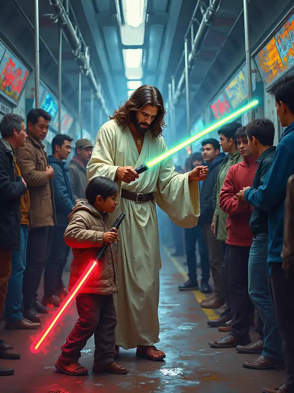 ਪ੍ਰਭਾਵਵਾਦੀ ਸ਼ੈਲੀ, ਇੱਕ ਵਿਅਸਤ ਸਬਵੇਅ ਵਿੱਚ ਯਿਸੂ ਦਾ ਮਨਮੋਹਕ ਦ੍ਰਿਸ਼, ਇੱਕ ਲਾਈਟਸਬਰ ਅਤੇ ਇੱਕ ਸਲੀਬ ਫੜਨ ਵਾਲੇ ਇੱਕ ਬੇਘਰ ਬੱਚੇ ਨਾਲ ਗਤੀਸ਼ੀਲ ਟਕਰਾਅ, ਰੌਸ਼ਨੀ ਵਾਲੇ ਰੰਗ, ਤਰਲ ਬੁਰਸ਼ ਦੀਆਂ ਲਾਈਆਂ, ਡੂੰਘੇ ਪਰਤ ਅਤੇ ਚਮਕਦਾਰ ਹਾਈਲਾਈਟਸ, ਭਾਵੁਕ ਮਾਹੌਲ, 4K, ਅਲਟਰਾ-ਡਿਟਲ ਟੈਕਸਟ, ਰੂਹਾਨੀਅਤ ਅਤੇ ਸੁਰੇਲਿਜ਼ਮ ਦਾ ਮਿਸ਼ਰਣ.