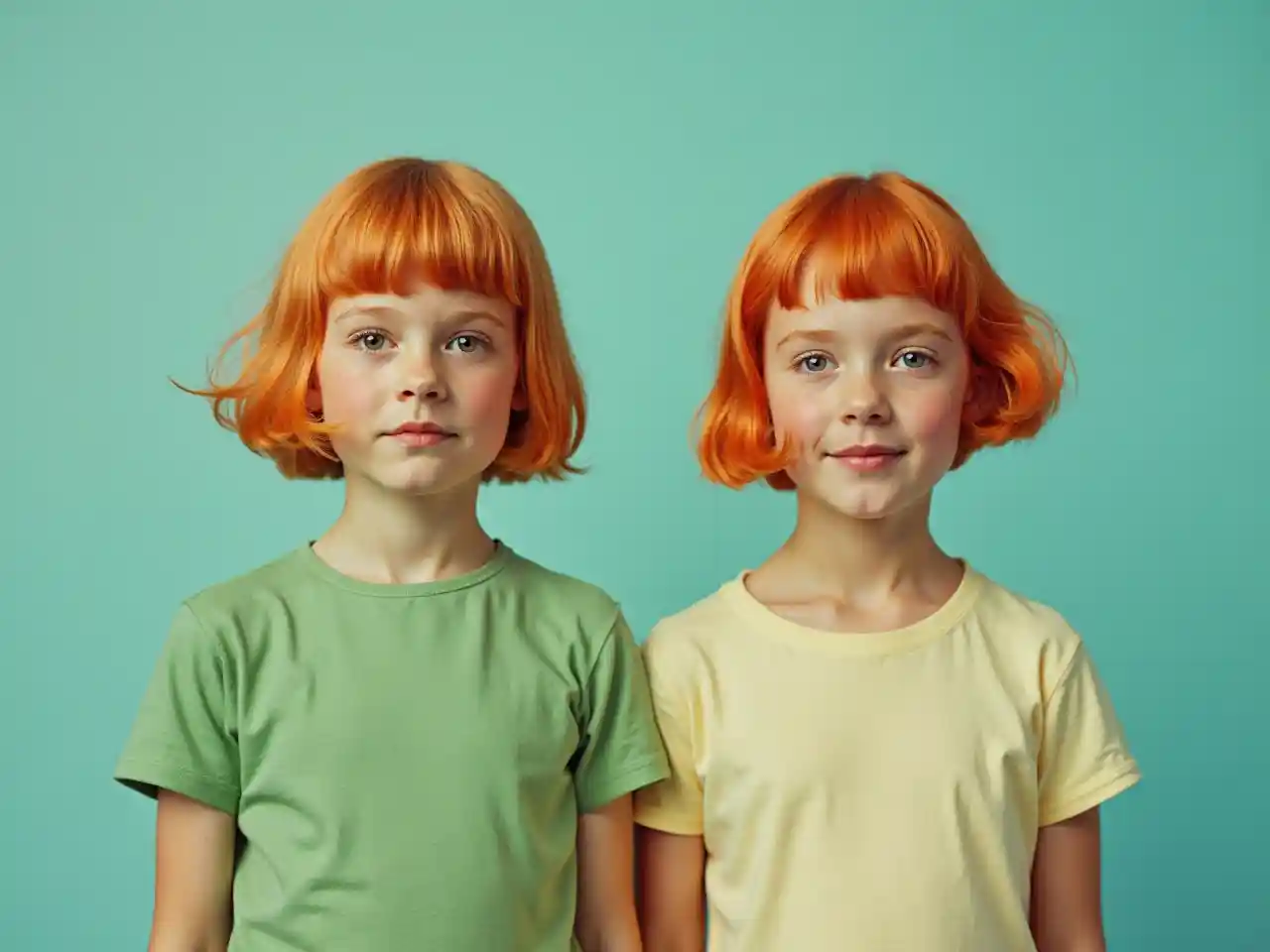 ਦੋ ਛੋਟੀਆਂ ਸੰਤਰੀ ਵਾਲਾਂ ਵਾਲੀਆਂ ਦੋ ਜਵਾਨ ਕੁੜੀਆਂ ਦਾ ਵਿੰਟੇਜ ਪੋਰਟਰੇਟ, ਇਕ ਦੂਜੇ ਦੇ ਕੋਲ ਖੜ੍ਹੇ, ਵੇਸ ਐਂਡਰਸਨ ਦਾ ਸਟਾਈਲ, ਸਾਹਮਣੇ, ਸਮੀਕਰਨ, ਸ਼ਾਨਦਾਰ ਵੇਰਵੇ, ਹਲਕਾ ਨੀਲਾ, ਹਰਾ, ਚਮਕਦਾਰ ਰੰਗ