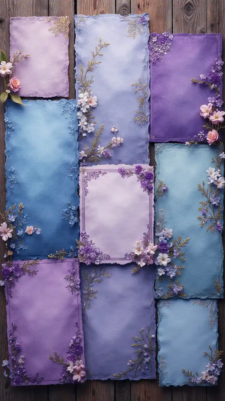 ਇੱਕ ਪੁਰਾਣੀ ਕਾਪੀ-ਪੱਤਰ ਦਾ ਸੰਗ੍ਰਹਿ, ਜੋ ਕਿ ਇੱਕ ਰੰਗ ਦੇ ਹਨ, ਜੋ ਕਿ ਇੱਕ ਹਵਾਦਾਰ ਲੱਕੜ ਦੀ ਸਤਹ ਉੱਤੇ ਖਿਲਰੇ ਹੋਏ ਹਨ। ਹਰ ਸ਼ੀਟ ਨੂੰ ਗੁੰਝਲਦਾਰ ਫੁੱਲਾਂ ਦੇ ਨਮੂਨੇ, ਸੁਨਹਿਰੀ ਸੋਨੇ ਦੀ ਫੁਆਇਲ ਦੇ ਨਾਲ ਸੂਖਮ ਵਾਟਰਮਾਰਕ ਨਾਲ ਸਜਾਇਆ ਗਿਆ ਹੈ। ਸਿਨੇਮੈਟਿਕ ਰੋਸ਼ਨੀ, ਹਾਈਪਰਰਿਅਲਿਸਟਿਕ ਵੇਰਵੇ, 32k ਰੈਜ਼ੋਲੂਸ਼ਨ।