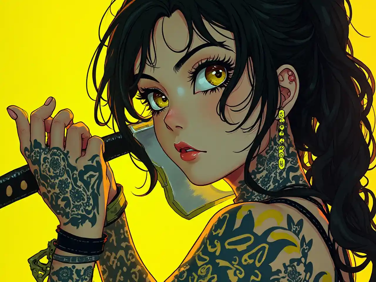 ਸੰਪਾਦਕੀ-ਪ੍ਰੇਰਿਤ ਵਿਵੀਅਨ ਟਾਮ ਫੋਟੋਗ੍ਰਾਫੀ ਵਿੱਚ ਜਾਪਾਨ ਤੋਂ ਇੱਕ ਗੋਥਿਕ ਪੁੰਕ ਬਾਗੀ ਨੂੰ ਦਰਸਾਇਆ ਗਿਆ ਹੈ, ਜੋ ਕਿ ਗੁੰਝਲਦਾਰ ਨੀਓਨ ਪੀਲੇ ਅਤੇ ਕਾਲੇ ਟੈਟੂ ਨਾਲ ਸਜਾਇਆ ਗਿਆ ਹੈ, ਇੱਕ ਸ਼ਾਨਦਾਰ ਕੈਟਨਾ ਹੈ. ਇੱਕ ਨੇੜਲੇ ਫੋਟੋ ਵਿੱਚ ਫੜਿਆ ਗਿਆ, ਚਿੱਤਰ ਇੱਕ ਪ੍ਰਗਟਾਵੇ ਵਾਲੀ ਟੈਕਸਟਰੀ ਗੁਣਵੱਤਾ ਦੇ ਨਾਲ ਐਨੀਮ ਕਲਾ ਵਿੱਚ ਸਟਾਈਲ ਕੀਤਾ ਗਿਆ ਹੈ, ਫੋਟੋ-ਯਥਾਰਥਵਾਦੀ ਤਕਨੀਕਾਂ ਦੀ ਵਰਤੋਂ ਕਰਦੇ ਹੋਏ. ਇਸ ਵਿੱਚ ਹੁਰਾਫੀਆ ਦੇ ਪ੍ਰਭਾਵ ਨਾਲ ਇੱਕ ਜੀਵੰਤ ਅਤੇ ਰੰਗੀਨ ਪੈਲ ਹੈ। ਇਹ ਕਲਾਕਾਰੀ 32k UHD ਵਿੱਚ ਪੇਸ਼ ਕੀਤੀ ਗਈ ਹੈ, ਜਿਸ ਵਿੱਚ ਤਰਲ ਗਤੀਸ਼ੀਲ ਬੁਰਸ਼ ਵਰਕ ਅਤੇ ਹਾਈਪਰ-ਡਿਟਲ, ਯਥਾਰਥਵਾਦੀ ਪੋਰਟਰੇਟ ਹਨ। ਤਿੱਖੇ ਕੋਣ ਅਤੇ ਸਖ਼ਤ ਕਿਨਾਰੇ ਵਾਲੀਆਂ ਪੇਂਟਿੰਗ ਤਕਨੀਕਾਂ ਉਕੀਓ-ਈ ਨੂੰ ਸ਼ਰਧਾਂਜਲੀ ਦਿੰਦੀਆਂ ਹਨ, ਜਿਸ ਨਾਲ ਅਸਲੀ ਸੰਕਲਪ ਨੂੰ ਬਰਕਰਾਰ ਰੱਖਦੇ ਹੋਏ ਸੂਖਮ ਰਚਨਾਤਮਕ ਸੁਧਾਰ ਕੀਤੇ ਜਾਂਦੇ ਹਨ.