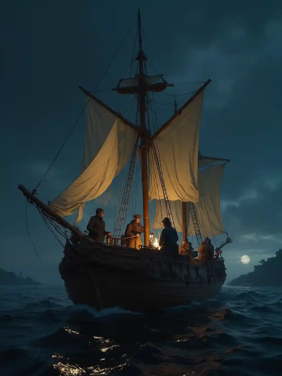 ਰਾਤ ਨੂੰ ਇੱਕ ਚਾਲਕ ਦਲ ਦੇ ਨਾਲ ਇੱਕ ਕਿਸ਼ਤੀ ਵਿੱਚ ਜਾਰਜ ਵਾਸ਼ਿੰਗਟਨ ਲੜਾਈ ਵੱਲ ਜਾ ਰਹੇ ਹਨ