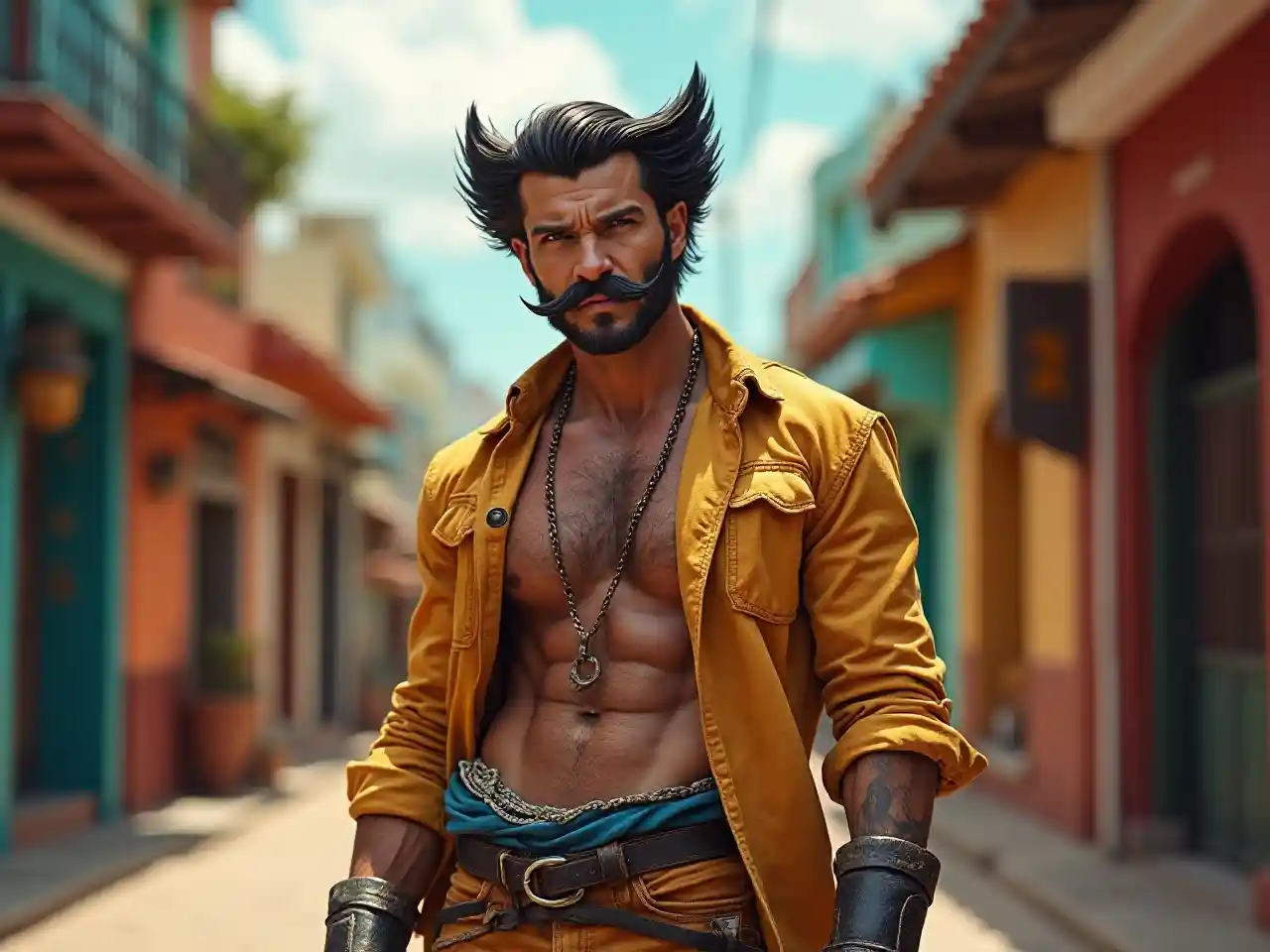 Elijahਮੈਕਸੀਕਨ ਕੱਪੜਿਆਂ ਅਤੇ ਬੂਗ ਮੂੰਹ ਨਾਲ ਮੈਕਸੀਕਨ ਗਲੀ 'ਤੇ ਵੁਲਵਰਿਨ ਐਕਸ-ਮੈਨ ਕਿਰਦਾਰ, ਰੰਗੀਨ ਬੈਕਗ੍ਰਾਉਂਡ, ਫੈਸ਼ਨ ਅਤੇ ਸਟਾਈਲਿਸ਼