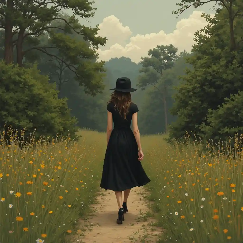 ਇੱਕ ਕਾਲੇ ਕੱਪੜੇ ਵਿੱਚ ਇੱਕ ਔਰਤ ਆਪਣੀ ਜਾਇਦਾਦ ਵਿੱਚ ਚੱਲਦੀ ਹੈ, ਡੀ ਨਿਕਸਨ ਦੀ ਸ਼ੈਲੀ ਵਿੱਚ ਚਿੱਤਰ