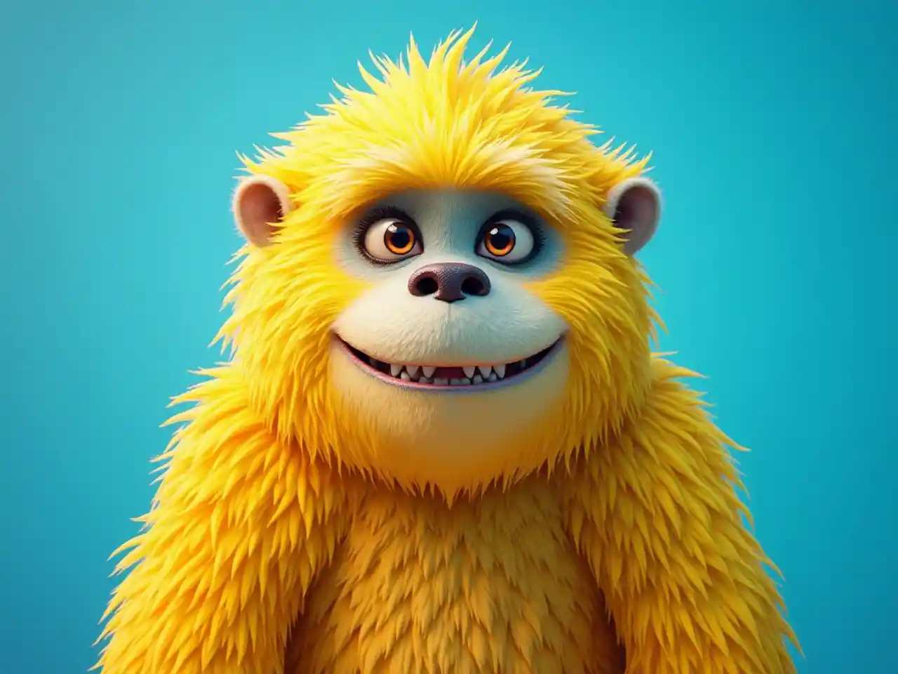 ਯੇਟੀ ਦਾ ਫੋਟੋ-ਯਥਾਰਥਵਾਦੀ ਪੋਰਟਰੇਟ, ਚਮਕਦਾਰ ਪੀਲੇ ਰੰਗ ਦਾ, ਚੰਗੇ ਚਿਹਰੇ ਦਾ ਪ੍ਰਗਟਾਵਾ, ਚਮਕਦਾਰ ਨੀਲਾ ਪਿਛੋਕੜ