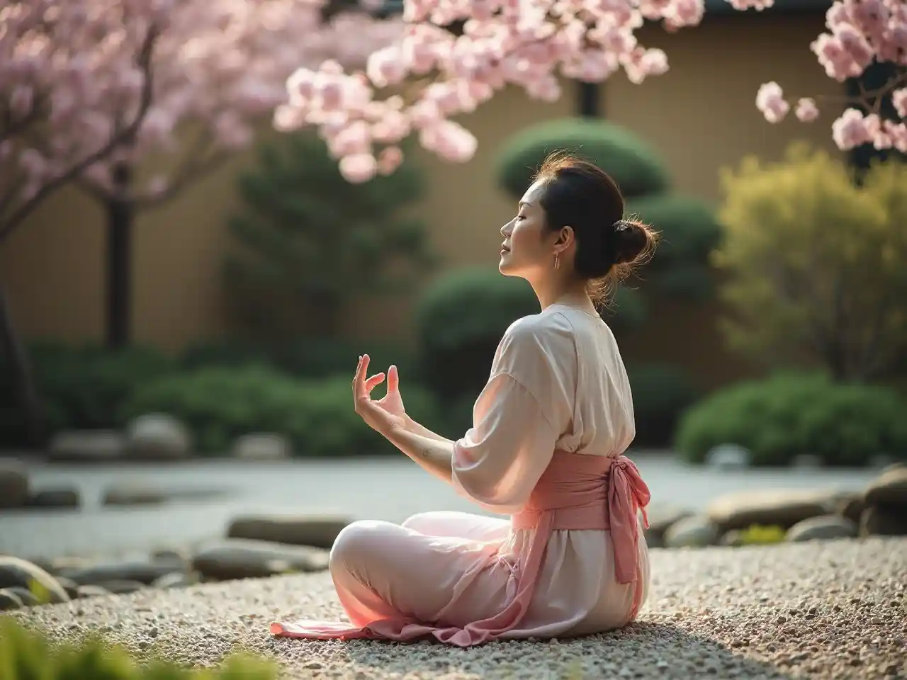 ਇੱਕ 40 ਸਾਲ ਦੀ ਚਮਕਦਾਰ ਏਸ਼ੀਆਈ ਔਰਤ ਇੱਕ ਜ਼ੈਨ ਬਾਗ਼ ਵਿੱਚ ਮਨਨ ਕਰਦੀ ਹੈ, ਉਸ ਦੀ ਲਹਿਰੀ ਕਿਮੋਨੋ ਸ਼ੈਲੀ ਦਾ ਕੱਪੜਾ ਉਸ ਦੀ ਸ਼ਾਨ ਨੂੰ ਉਜਾਗਰ ਕਰਦਾ ਹੈ, ਜਿਸ ਵਿੱਚ ਸਫਾਈ ਕੀਤੀ ਗਈ ਗੰਧ ਅਤੇ ਚੈਰੀ ਦੇ ਫੁੱਲ ਹਨ।